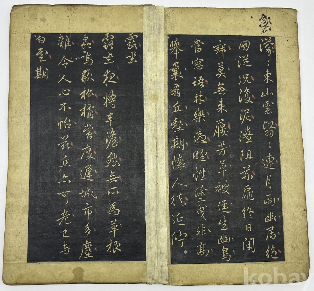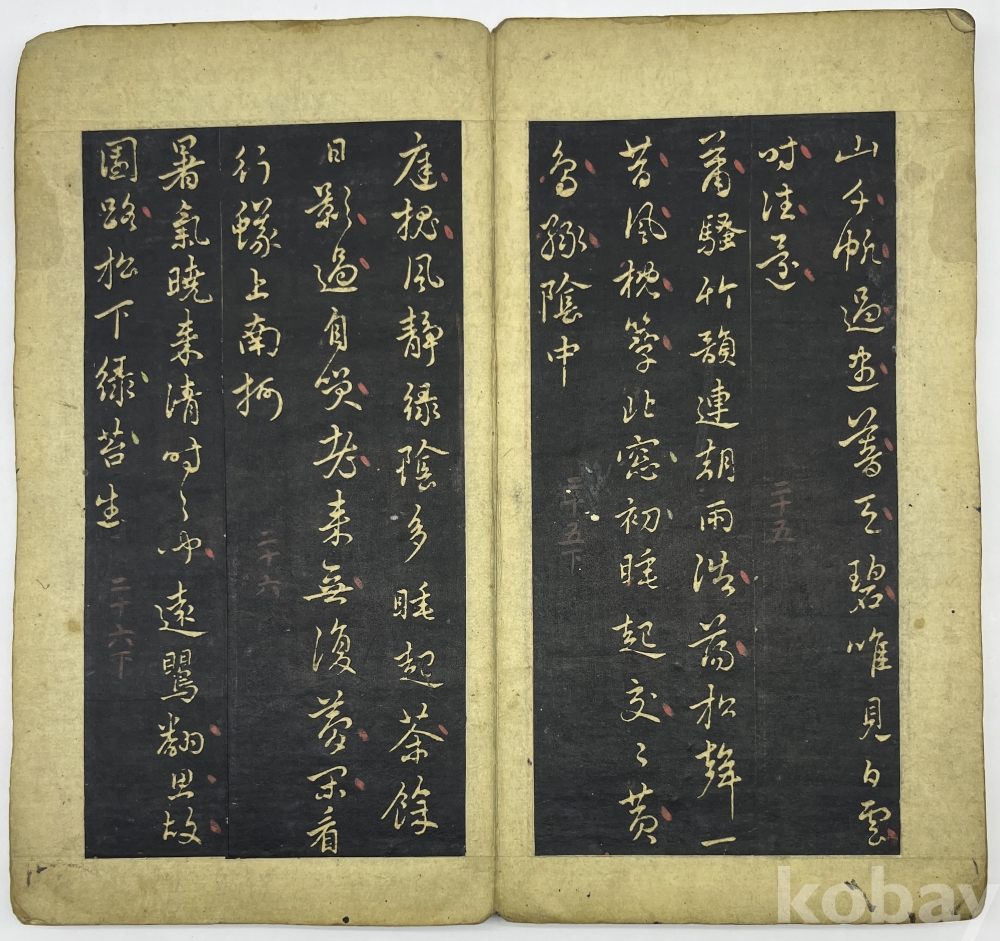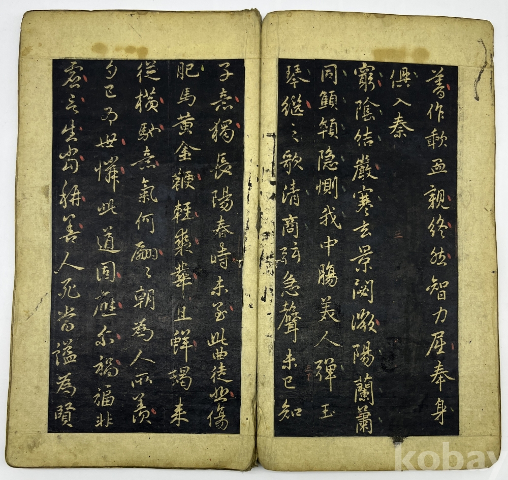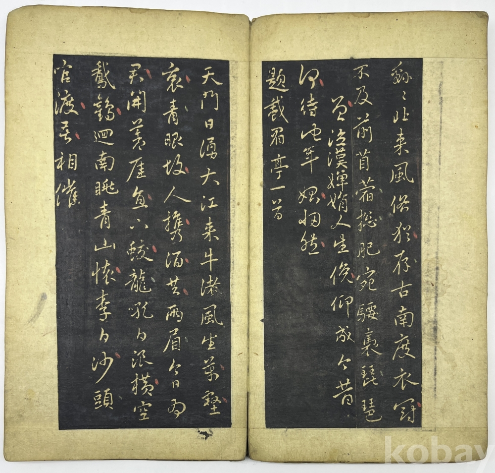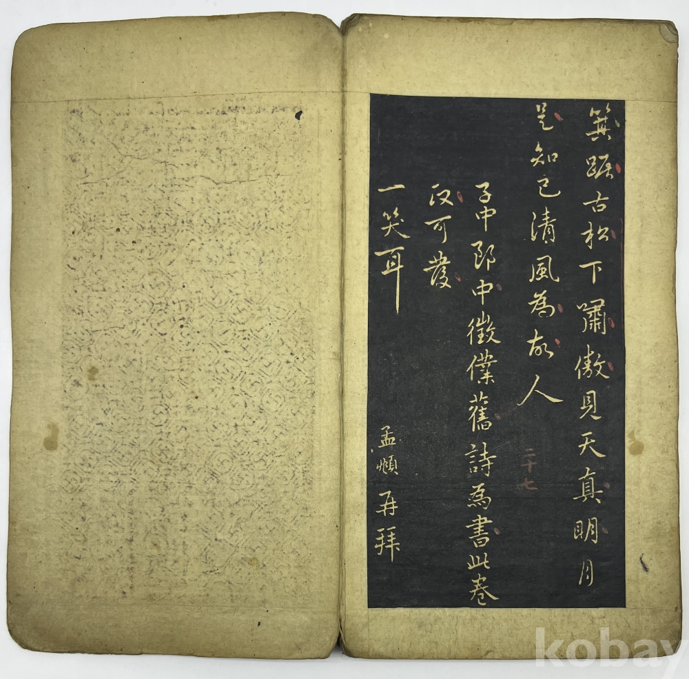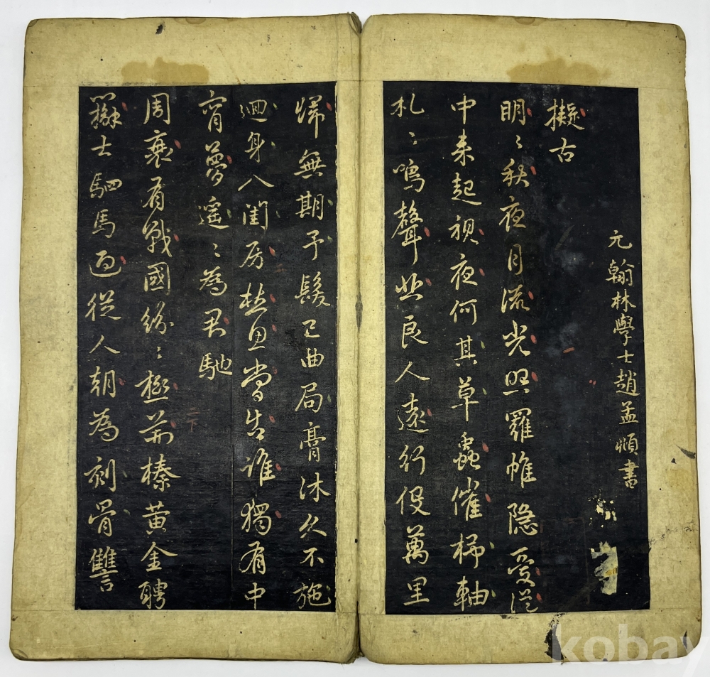 설 명 | 첫장의 첫줄은 ‘元 翰林學士 趙孟頫 書’이며 중국 삼국시대 중국 삼국시대 위(魏)나라의 문학가 조식(曹植, 192~232)의 시 ‘의고(擬古)’부터 시작한다. 중간부분부터는 조맹부가 지은 시가 이어진다. 마지막 장의 발문은 ‘子中郞中徵傑, 舊詩爲書此卷, 汲可發一笑耳(자중랑중 징걸을 위하여, 옛 시를 이 권에 써주니, 가히 한 번 웃음을 터뜨릴 만할 뿐이로다) 孟頫再拜. (맹부가 두 번 절하며 올림)’이다. 각 장위에 붉은 글씨로 장차를 표기하였는데 마지막 장 장차는 ‘二十七 ’이다. | |||||