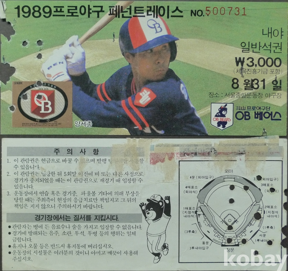 1989년 프로야구 OB 베어스 입장권 - 앞면 양세종 선수 -