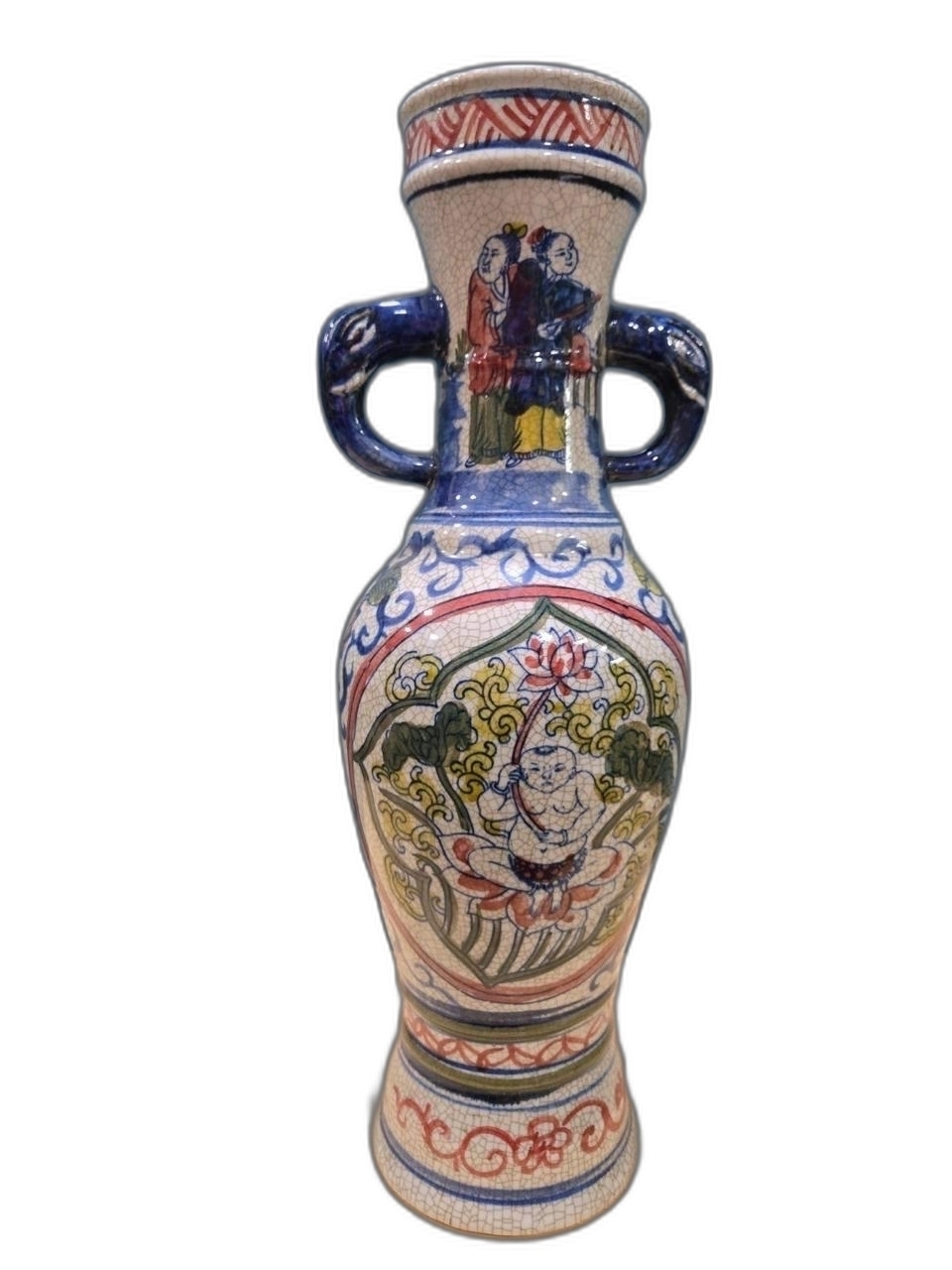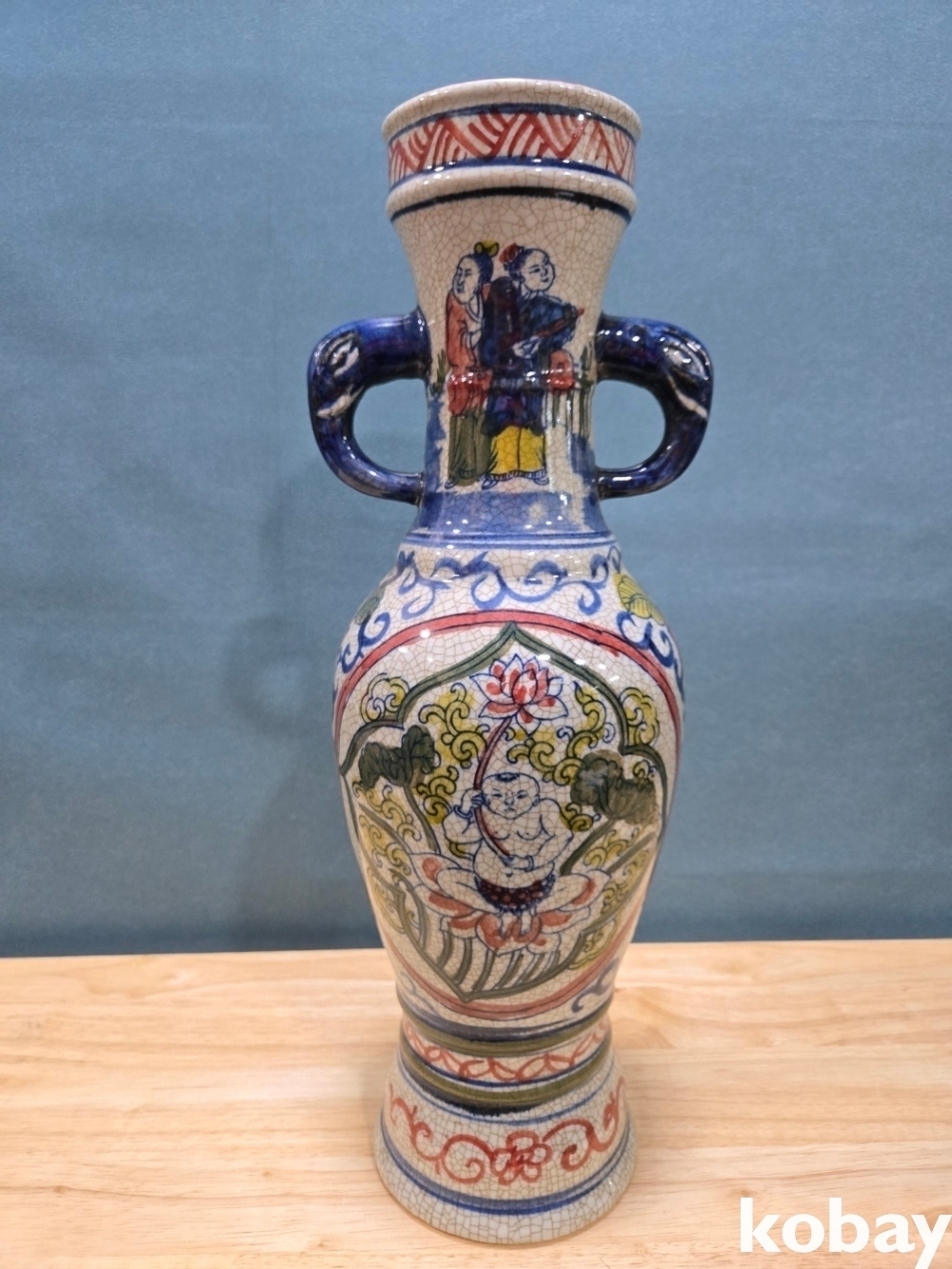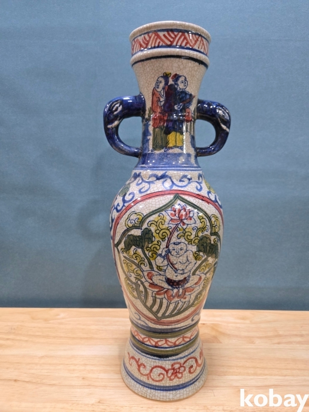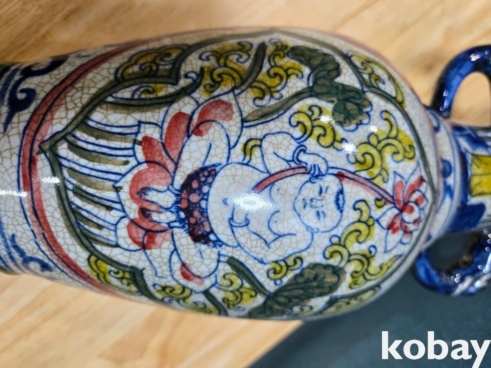 연꽃 위에 동자 표현 청화 도자기 입니다.
