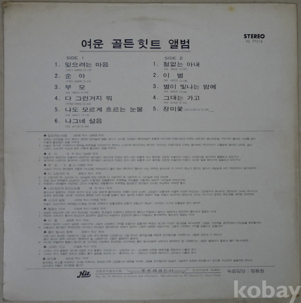 1977년 가수 여운 골든 힛트 앨범 음반 LP