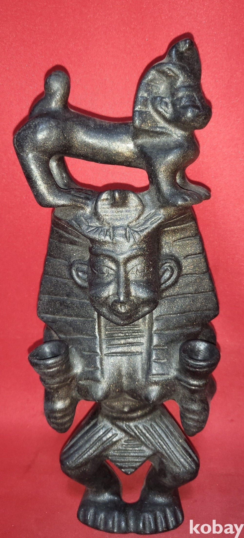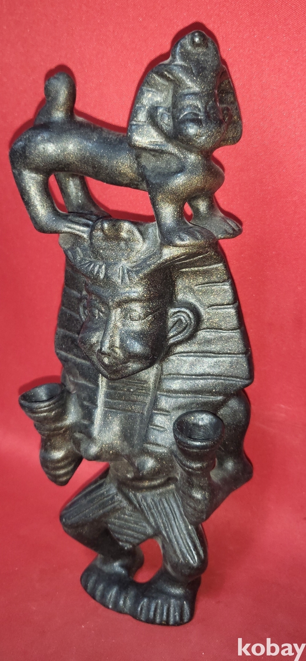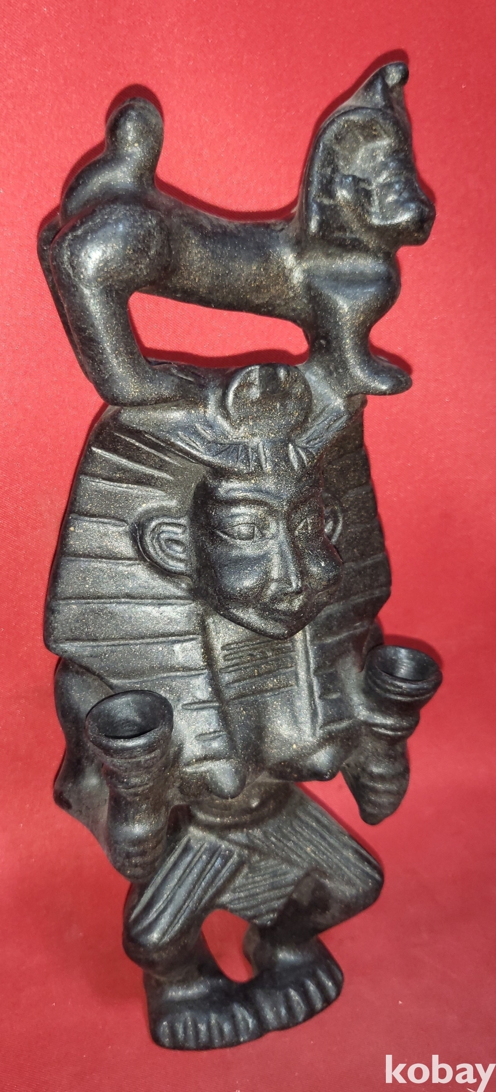 사람의 머리 위에 위에 동물이 서있는 형상입니다,