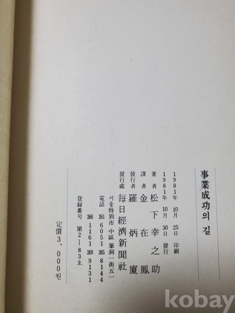 1. 사업성공의 길, 송하행지조(松下幸之助), 매일경제신문사, 1981년, 161쪽, 상태 상, 사진 참조