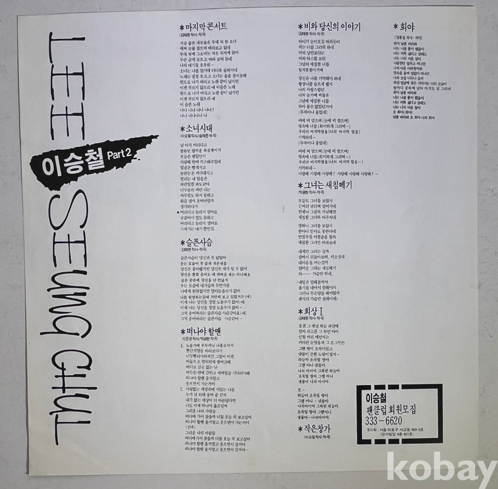 특이사항: 가사지가 포함되어 있으며, 가사지에는 이승철의 팬클럽 회원 모집 안내 등 당시의 시대상을 느낄 수 있는 자료들이 담겨 있어 수집용으로 가치가 높습니다.