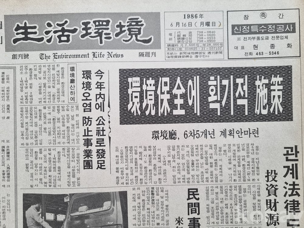 "1986년 6월 16일, 환경 보호의 첫걸음을 뗀 '생활환경신문' 창간호입니다."