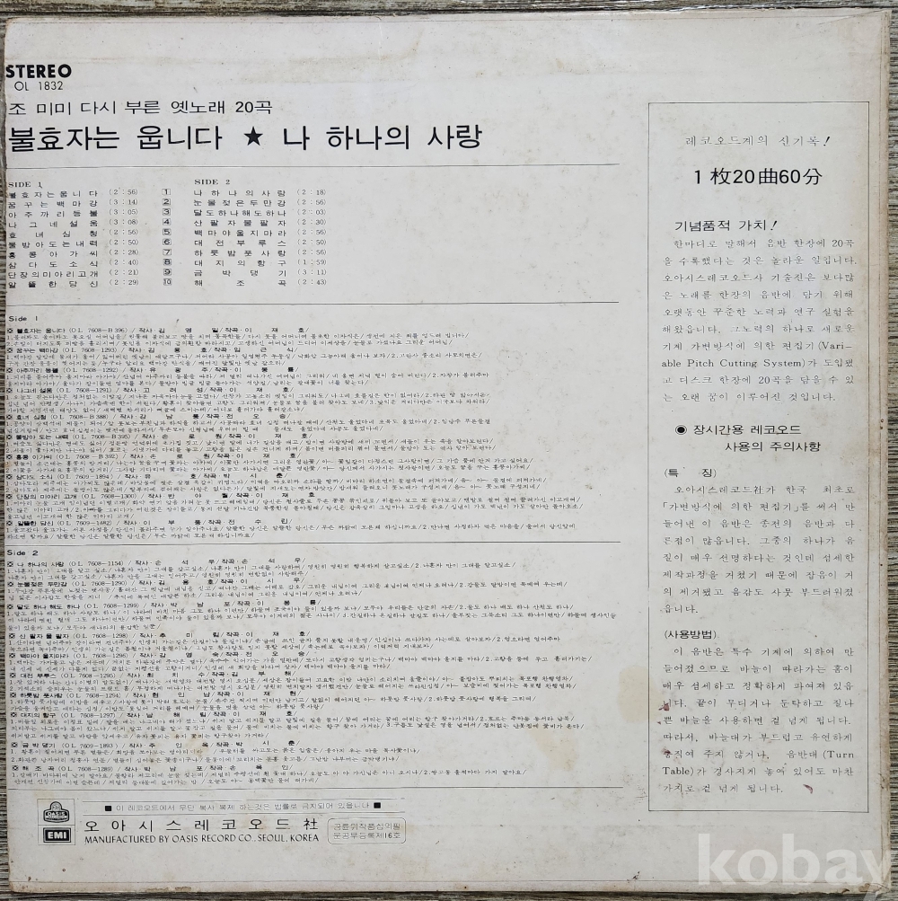 오아시스레코드사 발행 조미미 다시 부르른 당시 히트곡 20곡 수록.