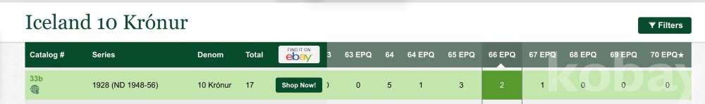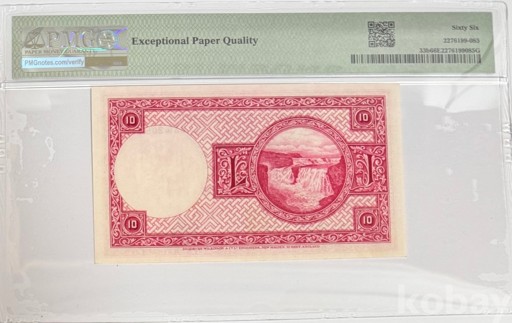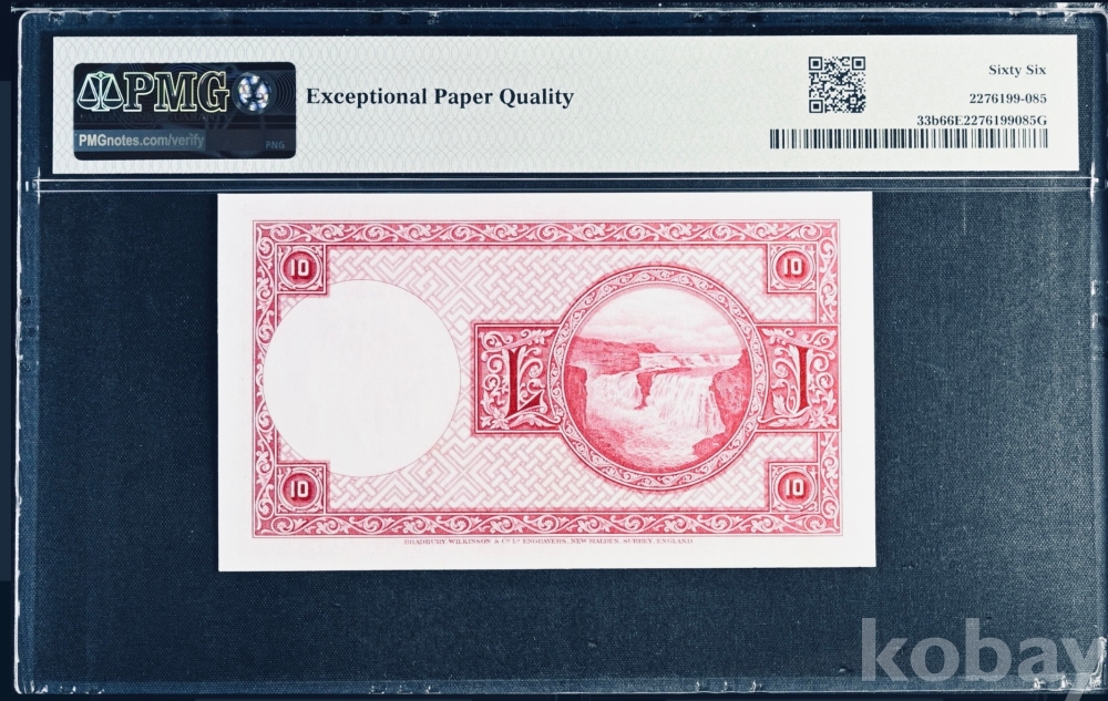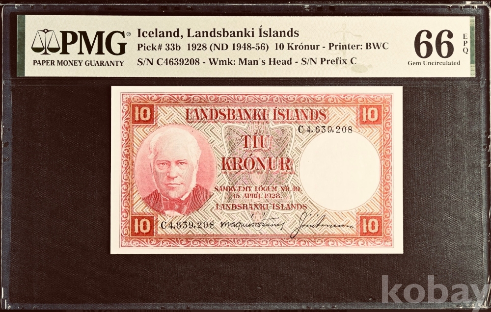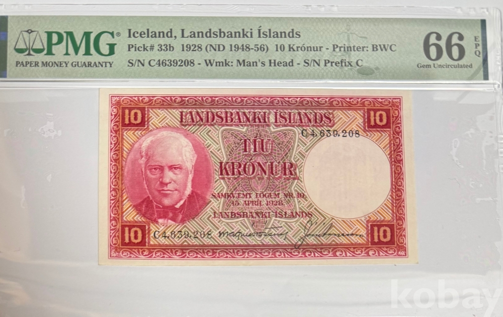 이 지폐는 아이슬란드 10크로나 지폐, 피크 번호 33b이다. 지폐에는 1928년 4월 15일 법률에 따른 표기가 남아 있지만, 실제 이 종류는 1948년부터 1956년 사이에 유통된 후기 발행권으로 본다. 앞면에는 아이슬란드 독립운동의 상징인 욘 시귀르드손의 초상이 들어가 있고, 뒷면에는 폭포 풍경이 배치되어 있어 아이슬란드의 자연과 국가 정체성을 함께 보여준다. 등급표의 66 우수 원지 품질 표시는 미사용에 가까운 높은 보존 상태와 원래 종이의 신선함이 잘 남아 있음을 뜻한다.