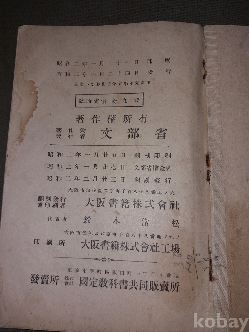 고서 & 준고서전 5 - 심상소학 산술서 尋常小學 算術書 제5학년 아동용/ 소화 2년(1927) 1월 24일 발행 교과서/ 저작 겸 발행자 文部省/ 일제시대 소학교 교과서