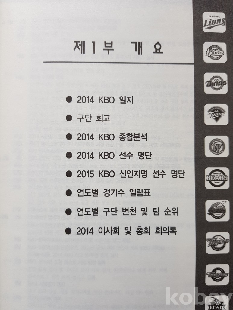 설명: 이 책은 KBO 한국야구위원회에서 매년 2014년 도의 프로야구단 감독 투수 야수 선수 야구 기록 안타 홈런 도루 승리 방어율 등 모든 자료를 기록하는 자료집입니다.