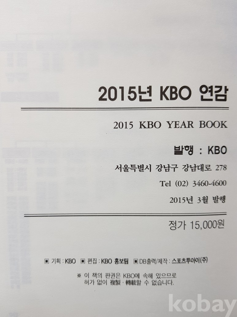 저자: 한국야구위원회 , 발행처: KBO , 발행일: 2015.03.01 , 규격: 13 * 8.8cm , 페이지: 942 , 상태: 미사용 상태 최상급 , 정가: 15,000원 , 수량: 1권