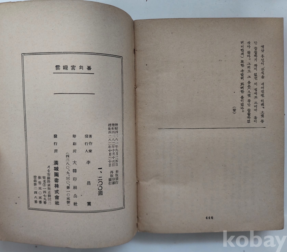 자료명/ 저자/ 발행/ 형태사항 | 『운현궁의 봄 · 雲峴宮의 봄』/ 金東仁 著/ 서울: 漢城圖書, 1949.10.20._재판/ 446p. 변색. 상태 양호. |
