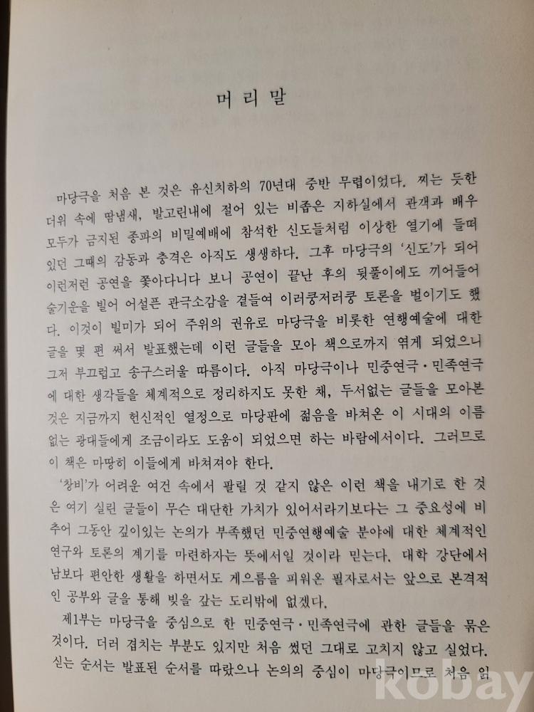 제1부는 마당극을 중심으로 한 민중극•민족연극에 관한 글모음.