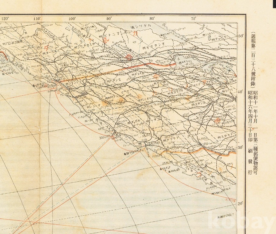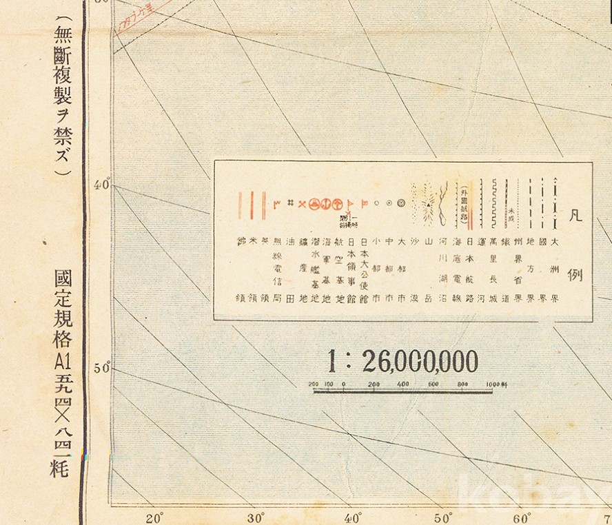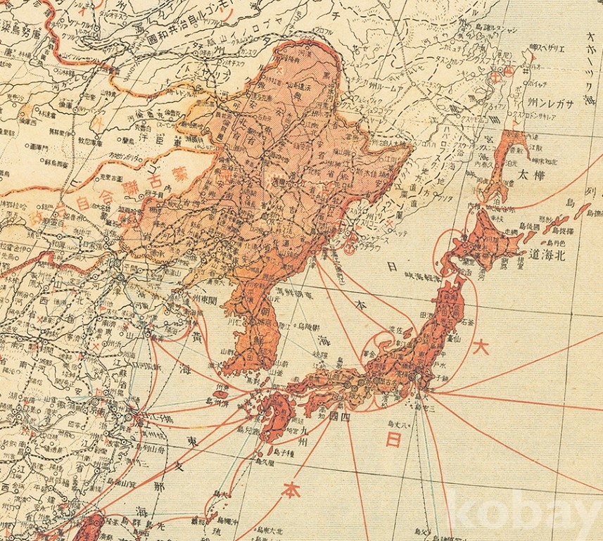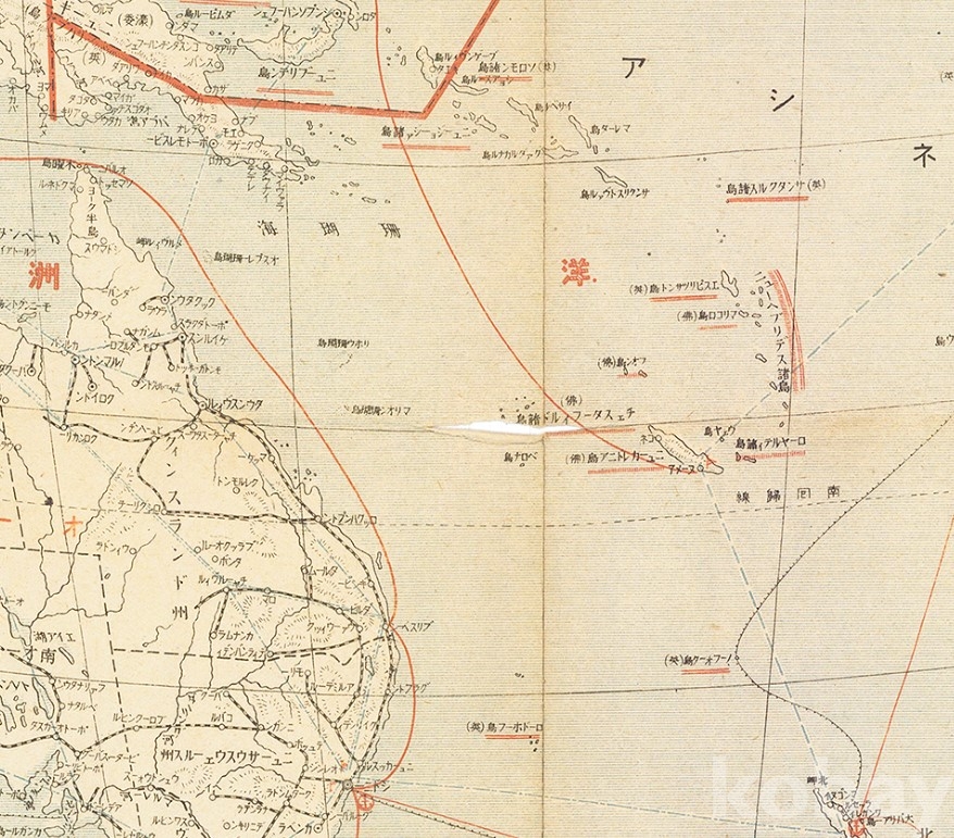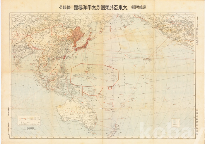 대동아지역과 태평양지역의 지도로 일본의 영토가 된 곳에 표기가 있고