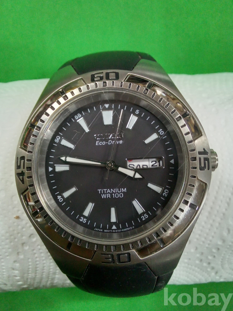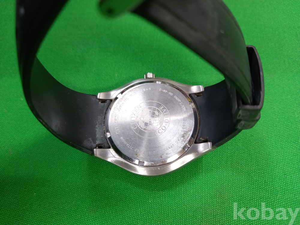 이 시계는 시티즌 에코 드라이브 티타늄 WR 100이며 E101 무브먼트를 사용합니다. 태양광이나 실내 조명 등 빛으로 충전되는 방식입니다. 배터리 교체가 필요 없으므로 시계가 멈췄다면 밝은 빛 아래에 두어 충전하면 되며, 가벼운 티타늄 소재로 제작되었으며, 10기압(100m) 방수를 지원합니다.