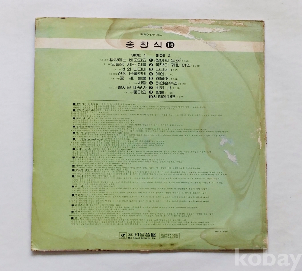 | 자켓상태 | EX : 약간의 마모, 모서리 찢김 존재 | 음반상태 | EX : 재생에 영향 없는 가벼운 기스 존재 | 발매정보 | 알수없음 | 가사지여부 | 무 |