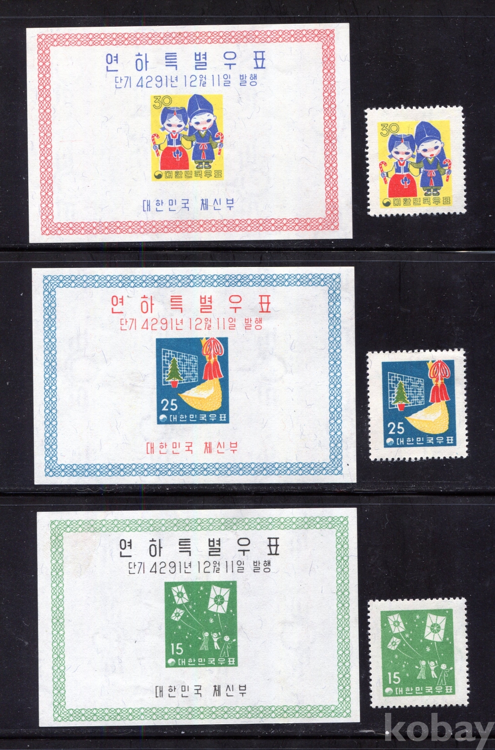 - [시트/우표] 1958년 2차 연하시트 및 우표 3종 (All MNH : Mint Not Hinged : 뒷면 힌지자국없이 깨끗한 상태)