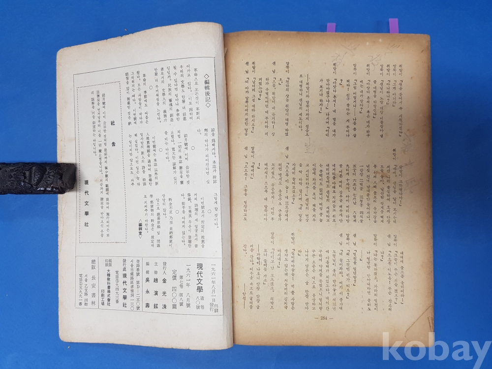 ▶朴斗鎭의 글 “詩薦後感”이 실린 現代文學 1961년 8월호, 월간 현대문학,284쪽