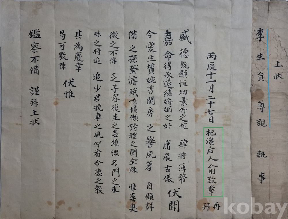 사돈 될 이생원(李生員)에게 보낸 혼서지.