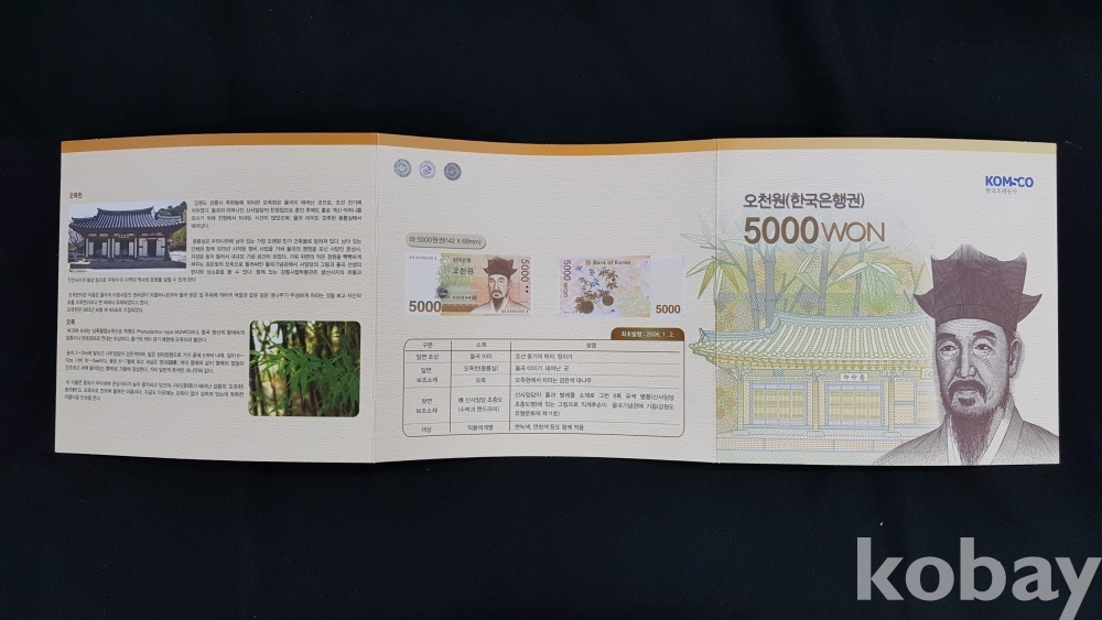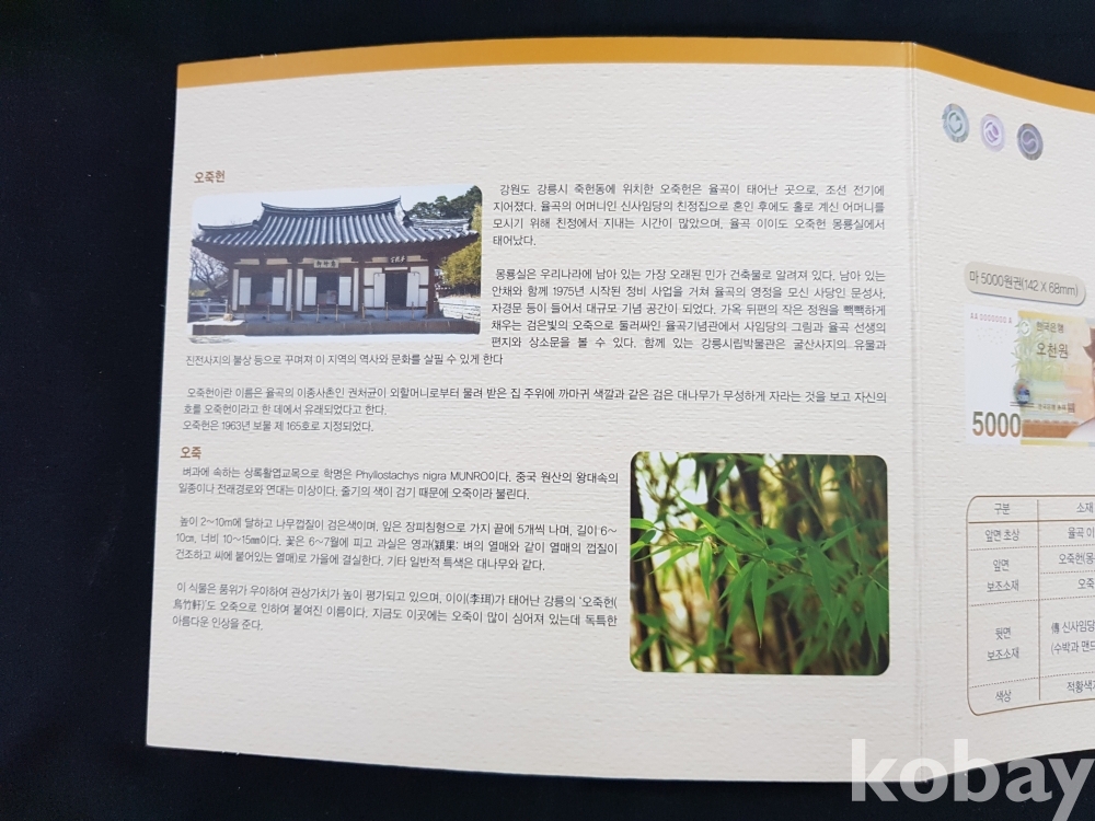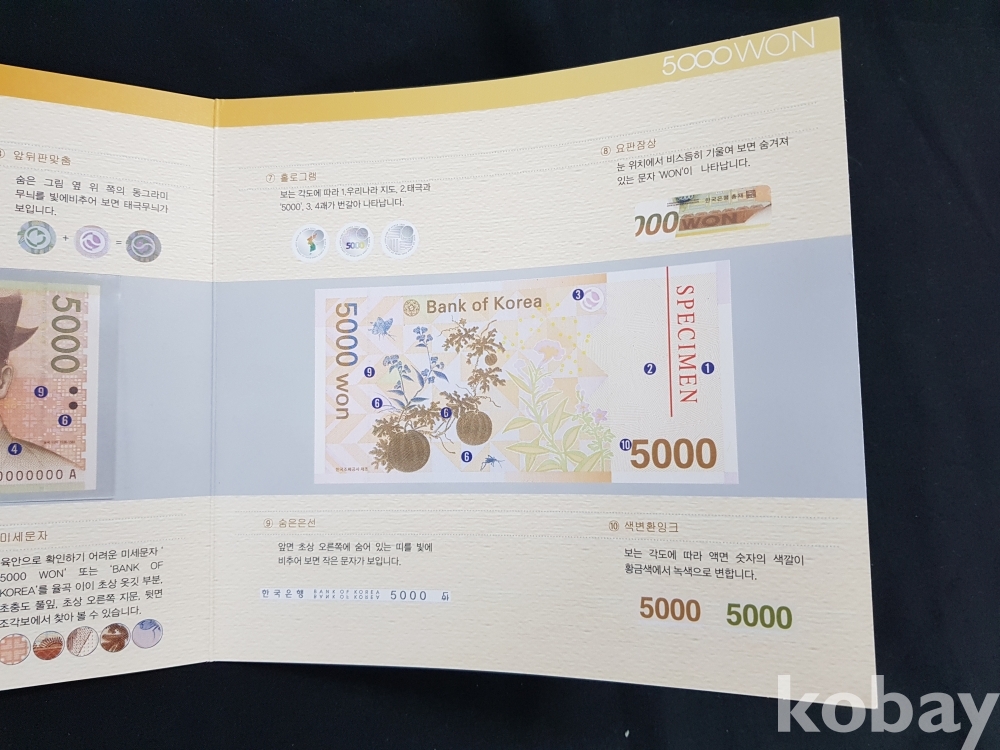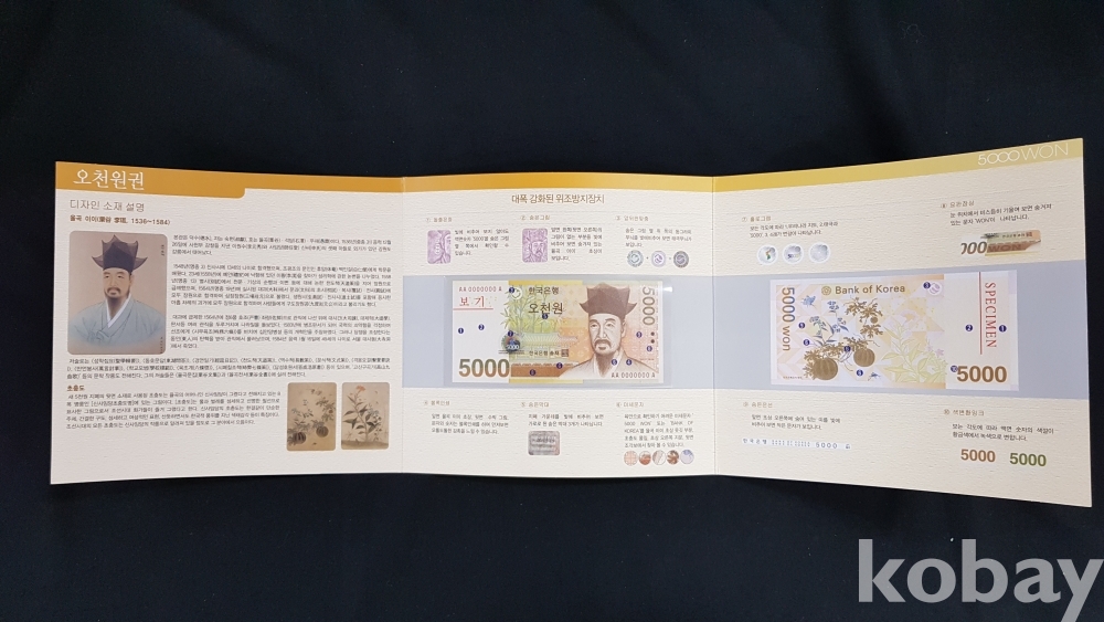 - 권종별 화폐첩은 3단으로 접혀있으며, 디자인 소재 설명.