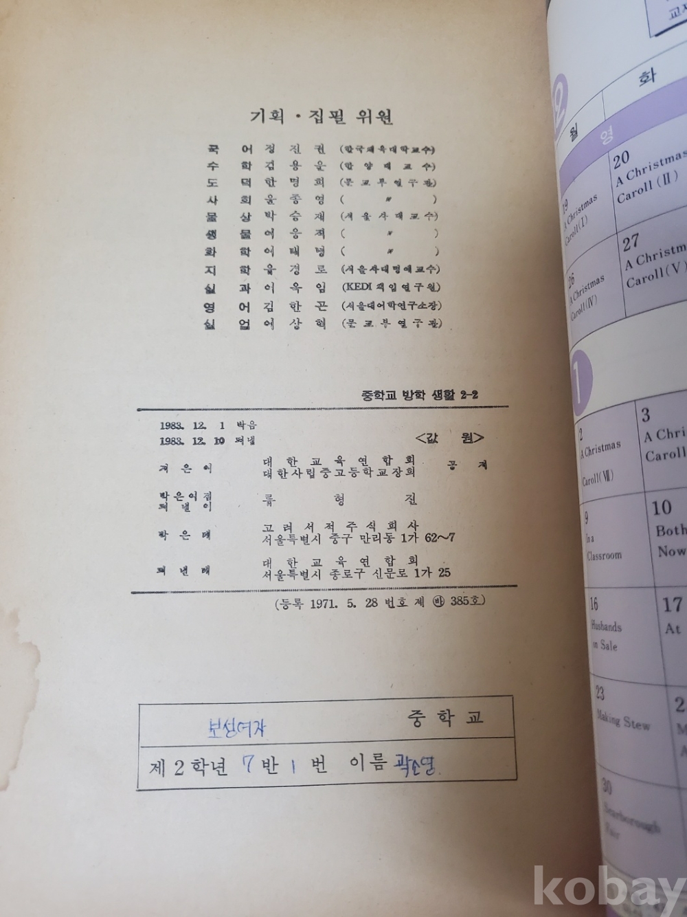 1. 중학교 겨울 방학생활 2, 대한교육연합회, 1982년, 162쪽, 상태 상, 사진 참조