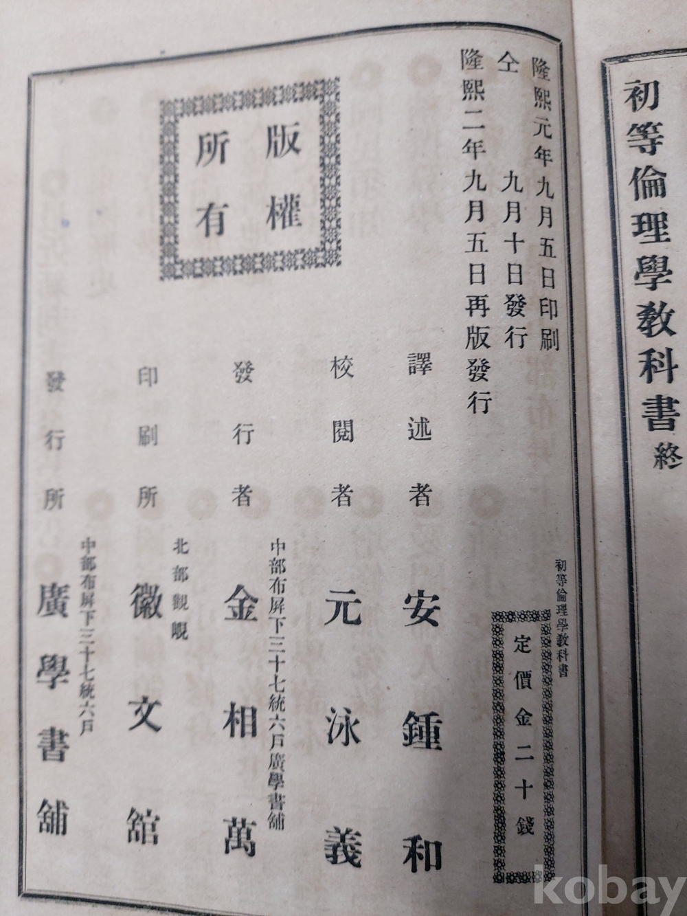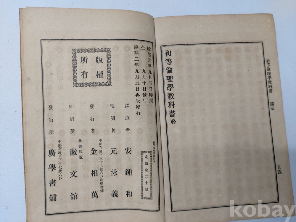 - (희귀본)초등용수신교과서 [초등윤리학교과서(初等倫理學敎科書)] 재판본.