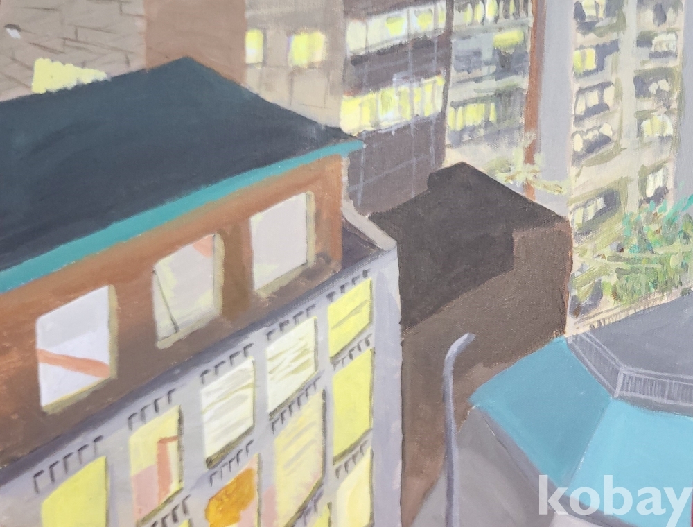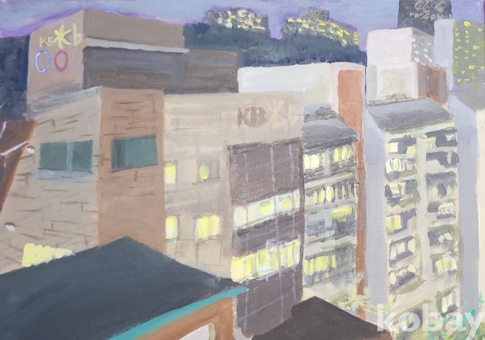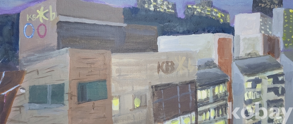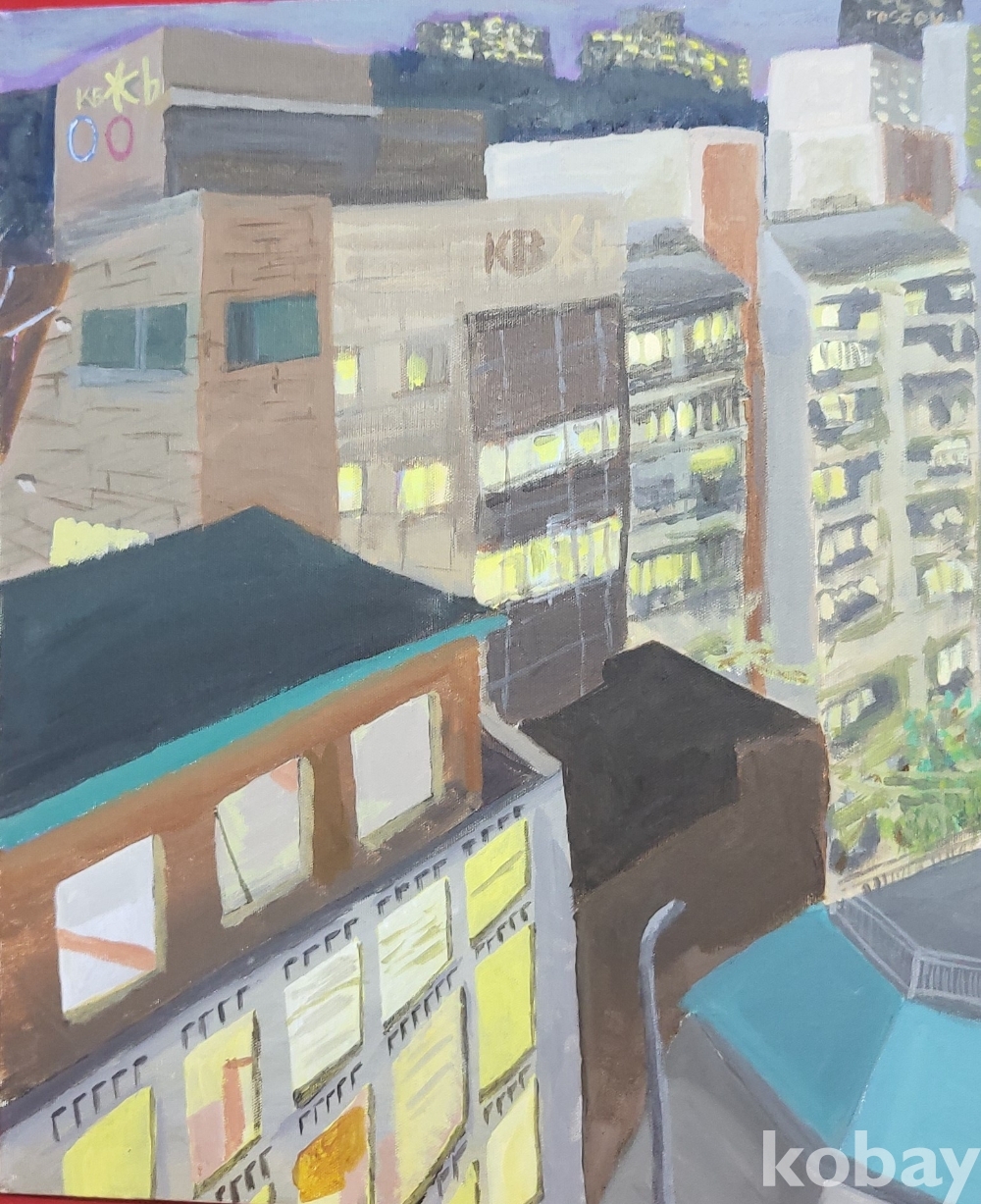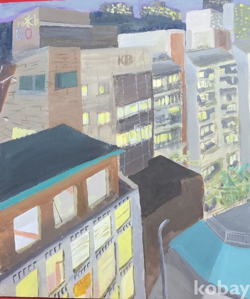 화가 김대영 표기가 보이는 켄버스 유화 국민은행 건물 작품 10호급입니다,