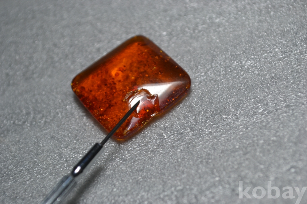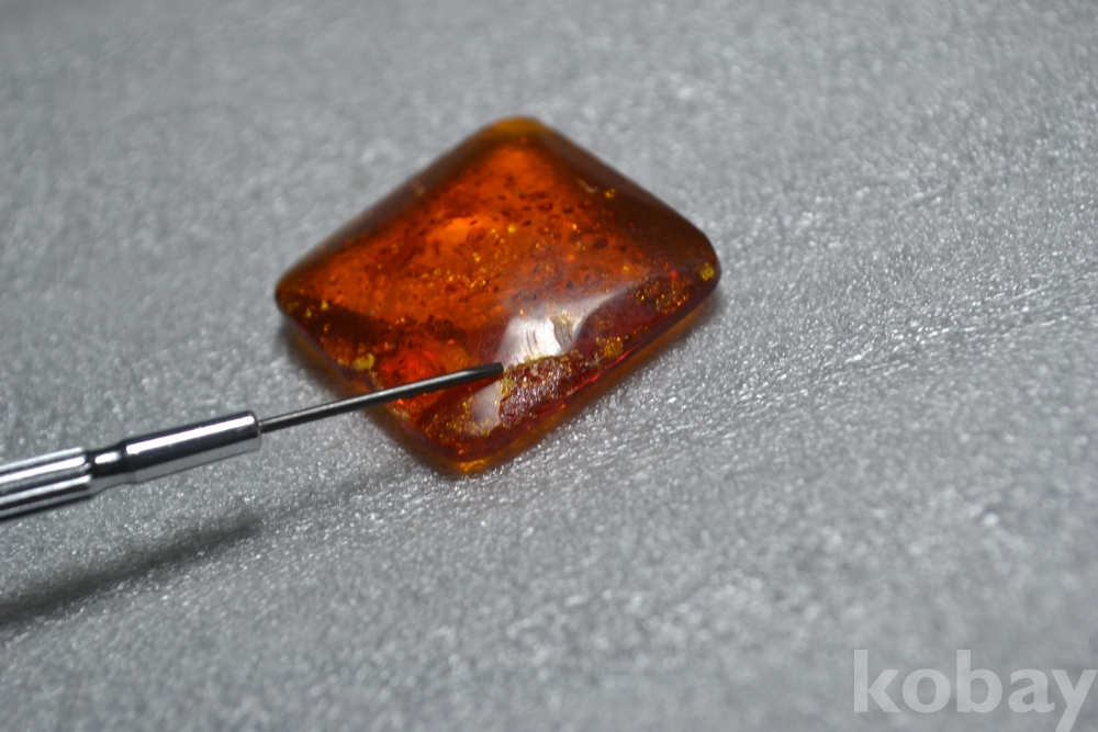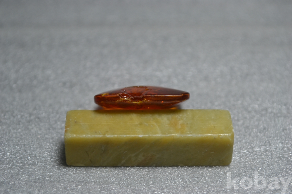 호박보석알의 표면부분(앞면측면부분)을 보시면 유리깨짐 형태의 큰 표면부 튐상처가 1곳 있습니다. (검은핀으로 가르킨 부분 2번째 사진참조) (측면부에도 튐상처가 이어져 있습니다. 사진참조)