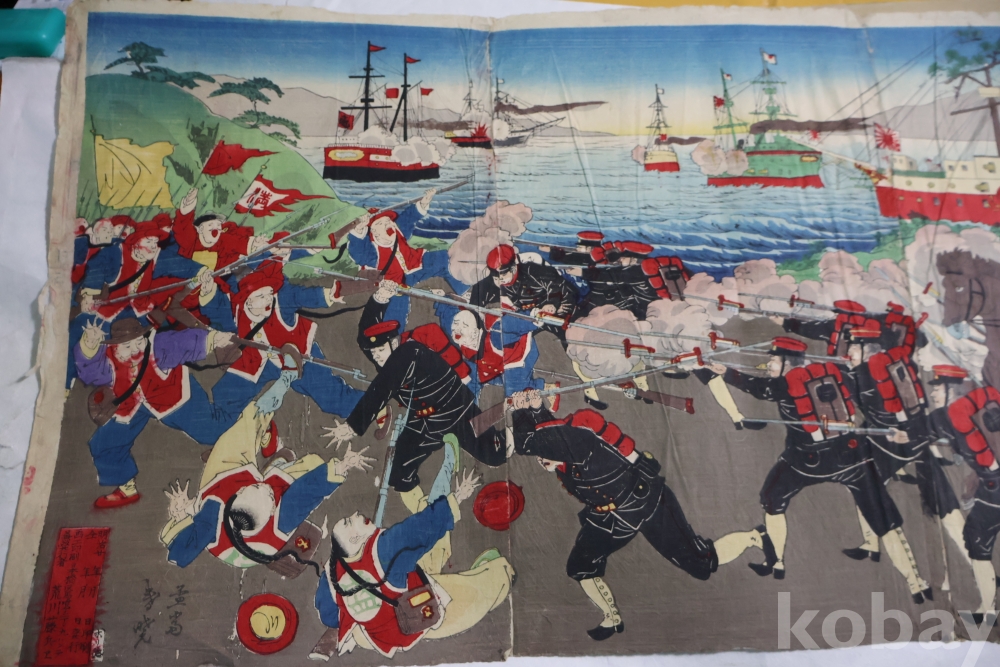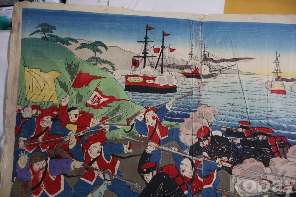 명치기의 청일 전쟁 목판화 3 연속 원본 목판화 임니다 제작 년도를 가진 명품 임니다 세월의 흔적을 가진 원본 목판화 명치2? 바다의 풍경을 가진 명작 임니다