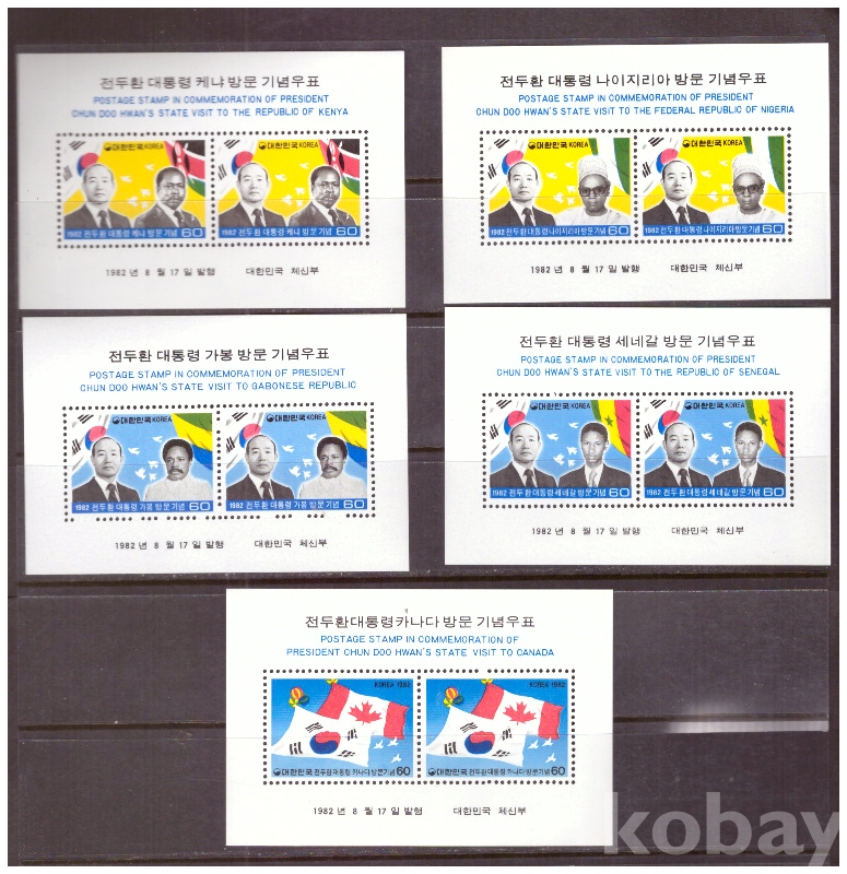(한국시트) 1982.8.17 전두환대통령 케냐,나이지리아,가봉,세네갈,카나다 방문 5완 sheet of 2 MNH