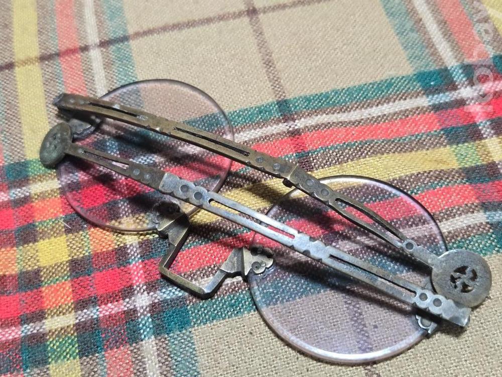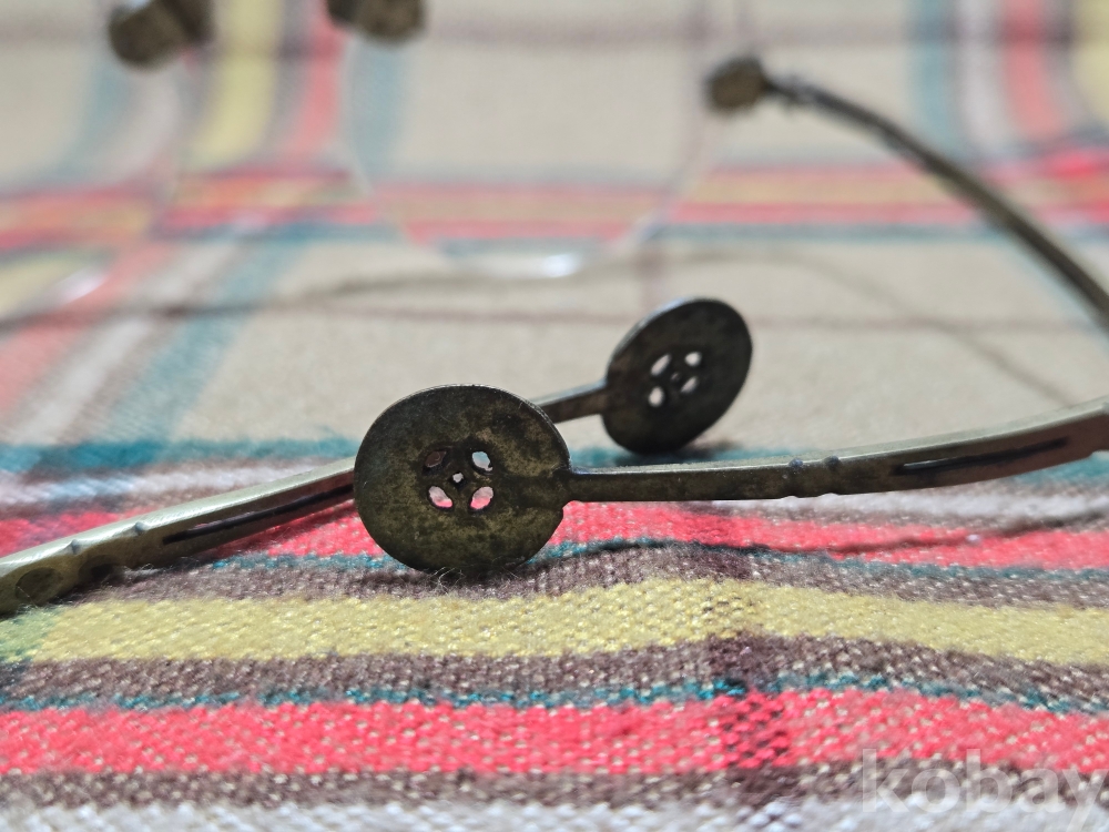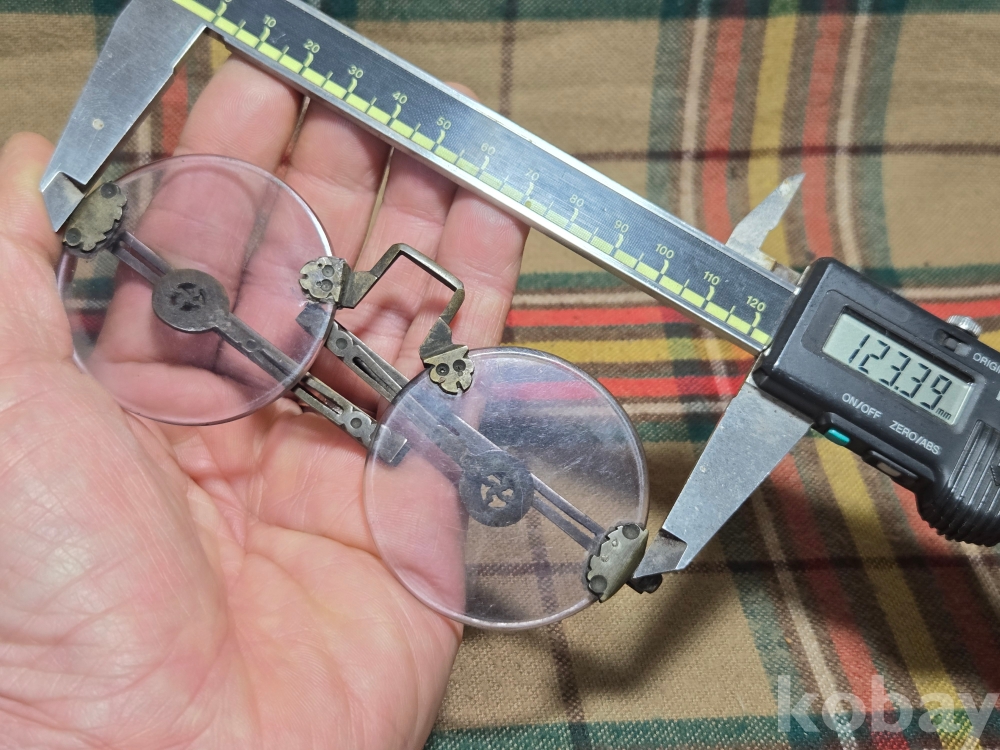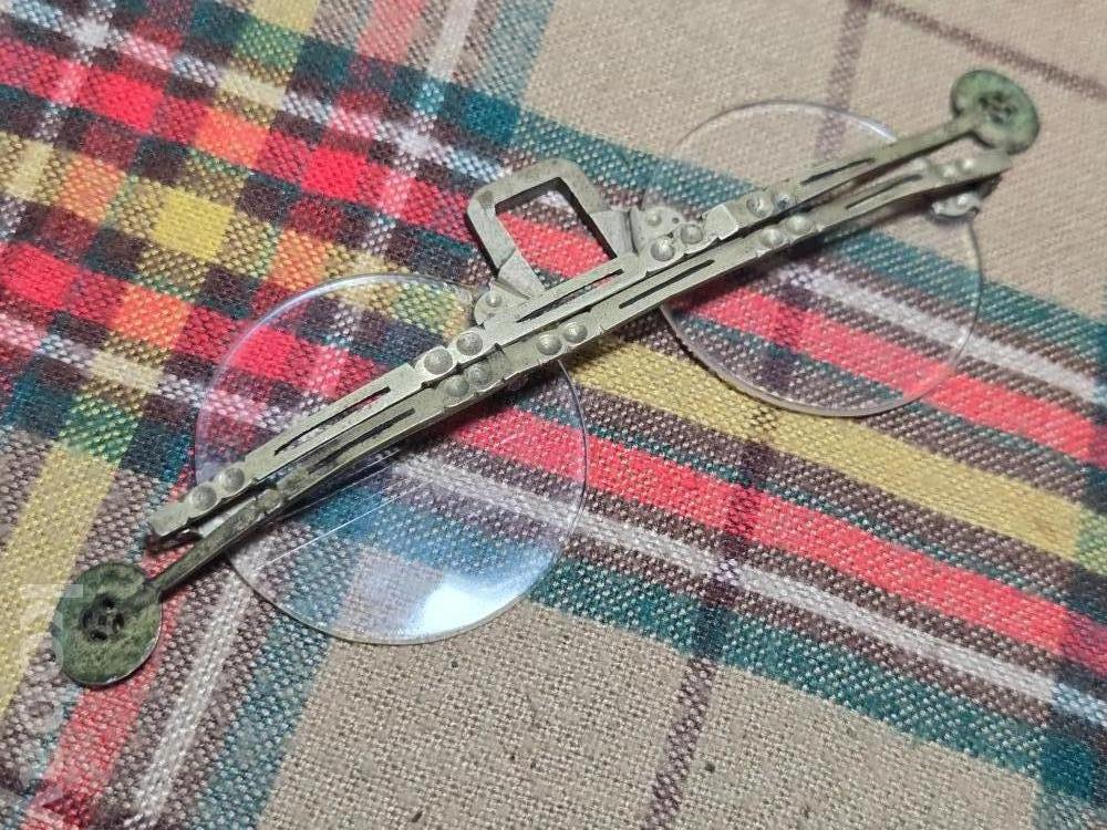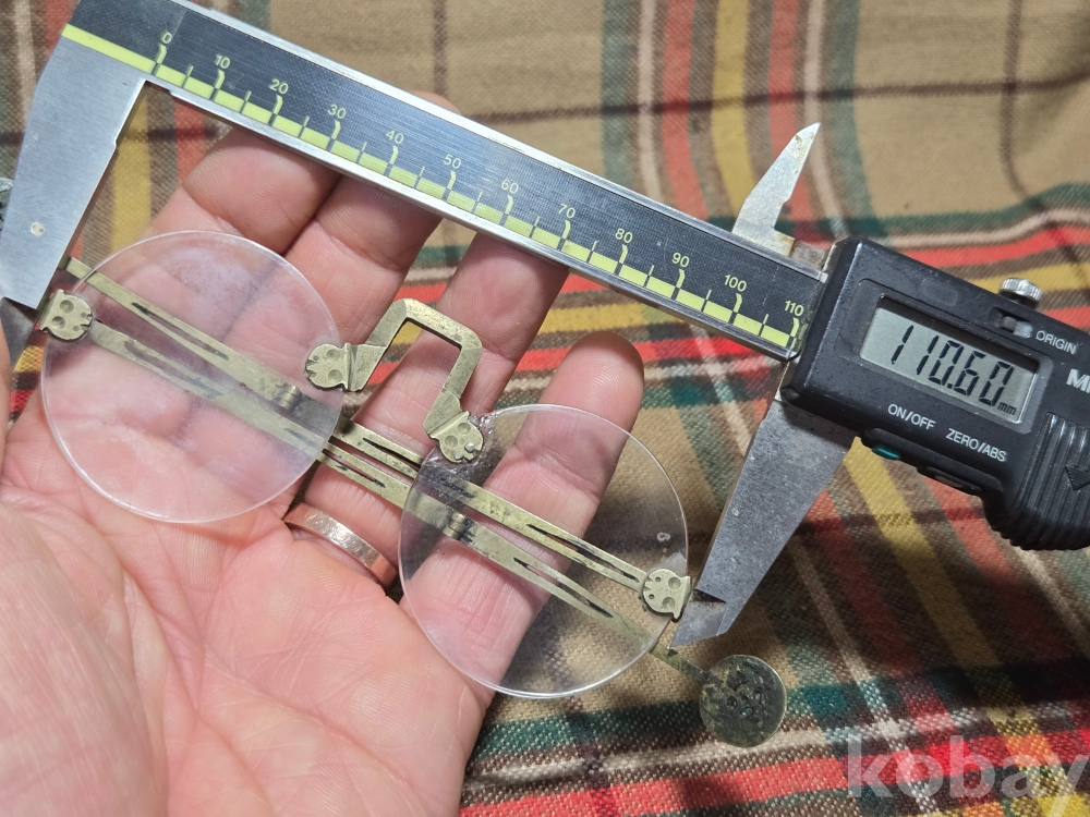 작은사이즈의 여성용 안경은 희귀한 규격으로 돋보기용 도수렌즈가 들어있지만 코걸이대와 연결부분의 유리말단부 파손으로 본드로 붙여두었습니다. 백동부분은 전혀손상이 없어 안경알을 교체하실수 있습니다. 사진참고~~
