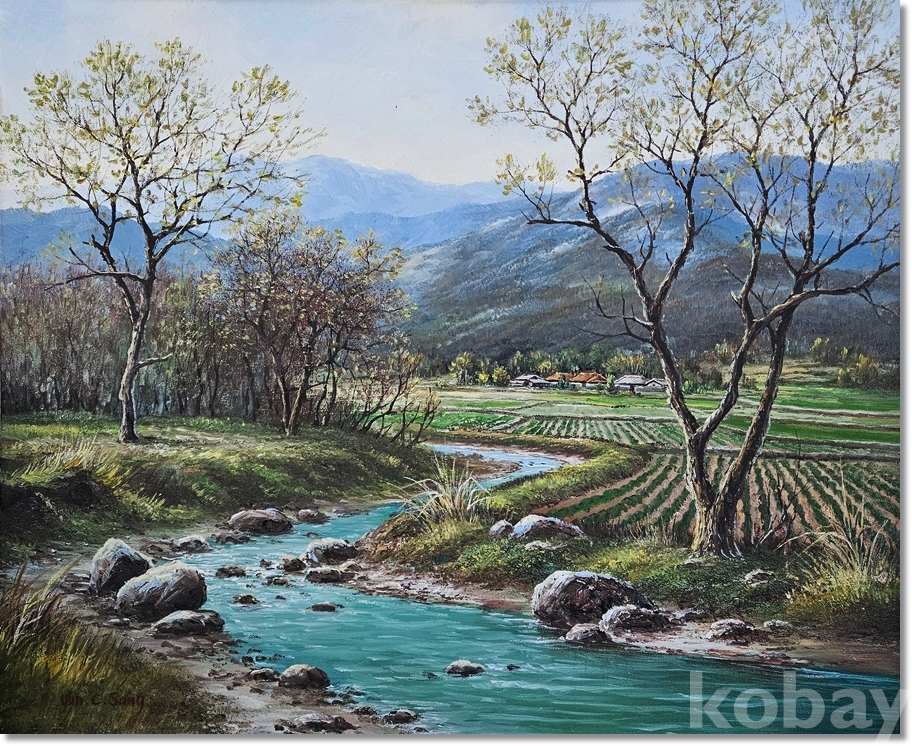 윤철상의 추경. 가을 농가의 풍경을 사실적 터치로 평온하게 표현한 작품입니다.