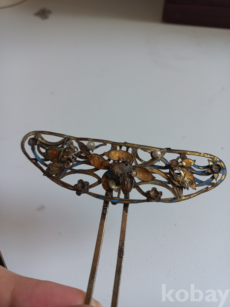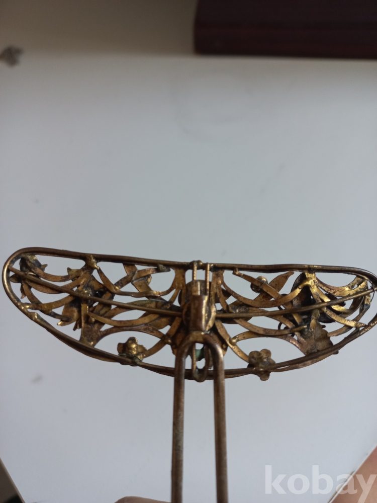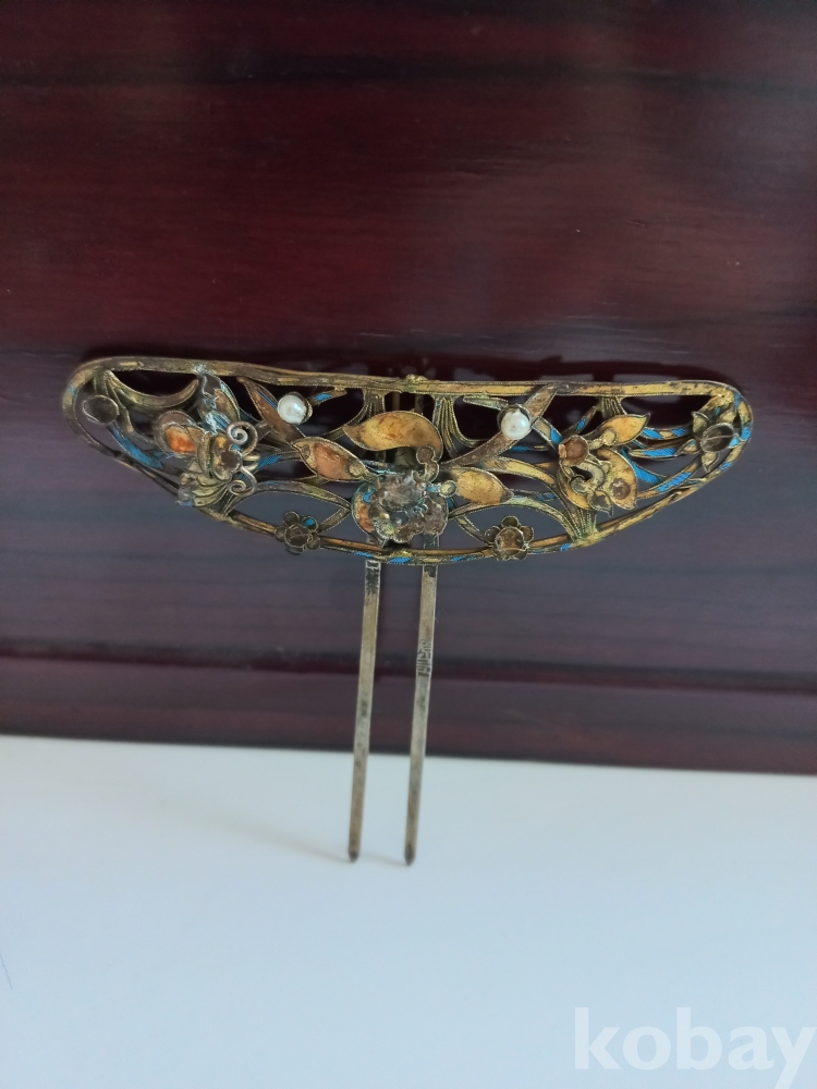 청나라 대랍시 같은 가체에 쓰이던 금동 점취 꽂이 입니다. 무늬가 마치 아르누보 적인 느낌이 이국적입니다. 쪽머리 댕기부분에 꽂으면 눈에 띄는 우아함이 돋보입니다. 점취탈락이 있으나 몇몇 조각은 붙어있습니다. 가운데 꽃부분에서 꽃술하나가 탈락됐는데 현재 같이 보관하고 있습니다. 점취 장신구는 이전 조선에서 청나라를 다녀오면 부인들 물건으로 들여왔다 합니다.