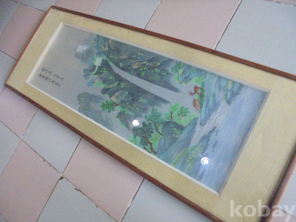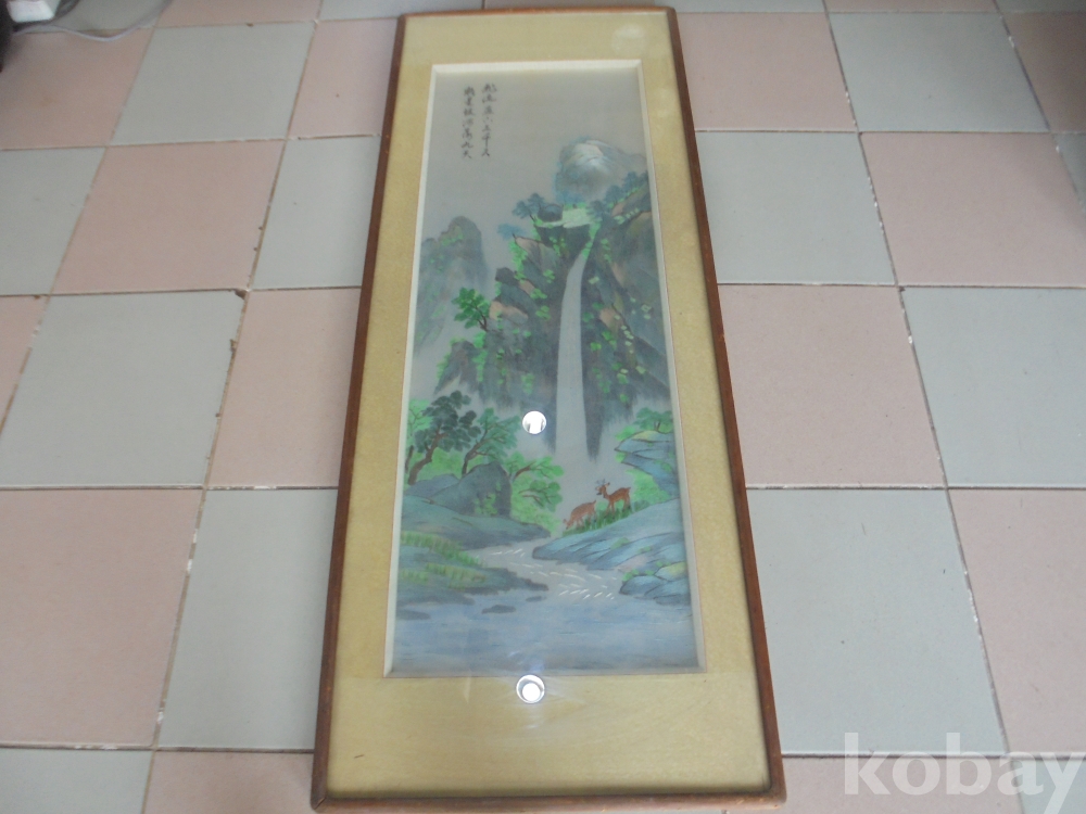 표구한것이 6.70년대초까지 유행하던 깨끗한것으로 높은산과 나무 직포폭포와 사슴 신선이노닐만한 풍경을 손수로 잘놓은 당시의 바람을