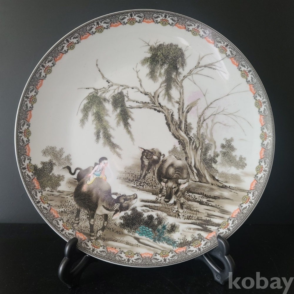 그림이 화려하게 전사된 도자기 접시입니다. 미사용 작품으로 좌대와 함께 제공되며 사이즈와 무게 모두 장식용으로 두고 보시기에 손색없는 작품입니다