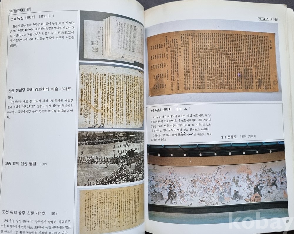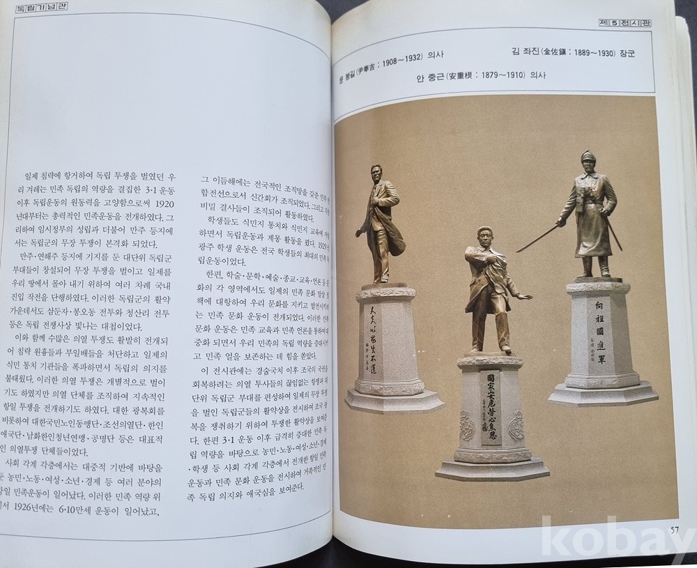 주요 유물 사진: 3·1 독립선언서, 2·8 독립선언서, 김좌진 장군·안중근 의사 동상, 휴전 협정서 복제본 등.