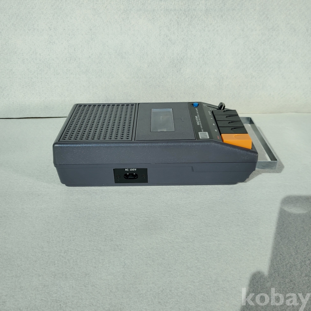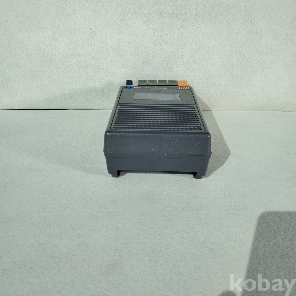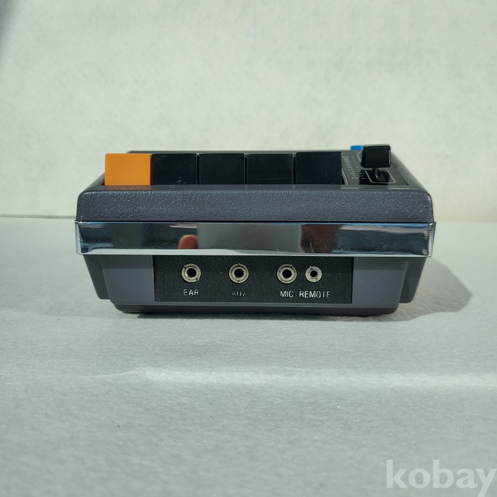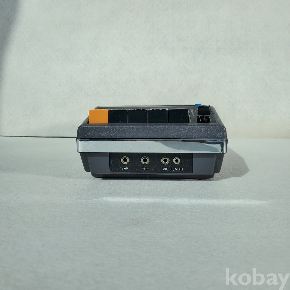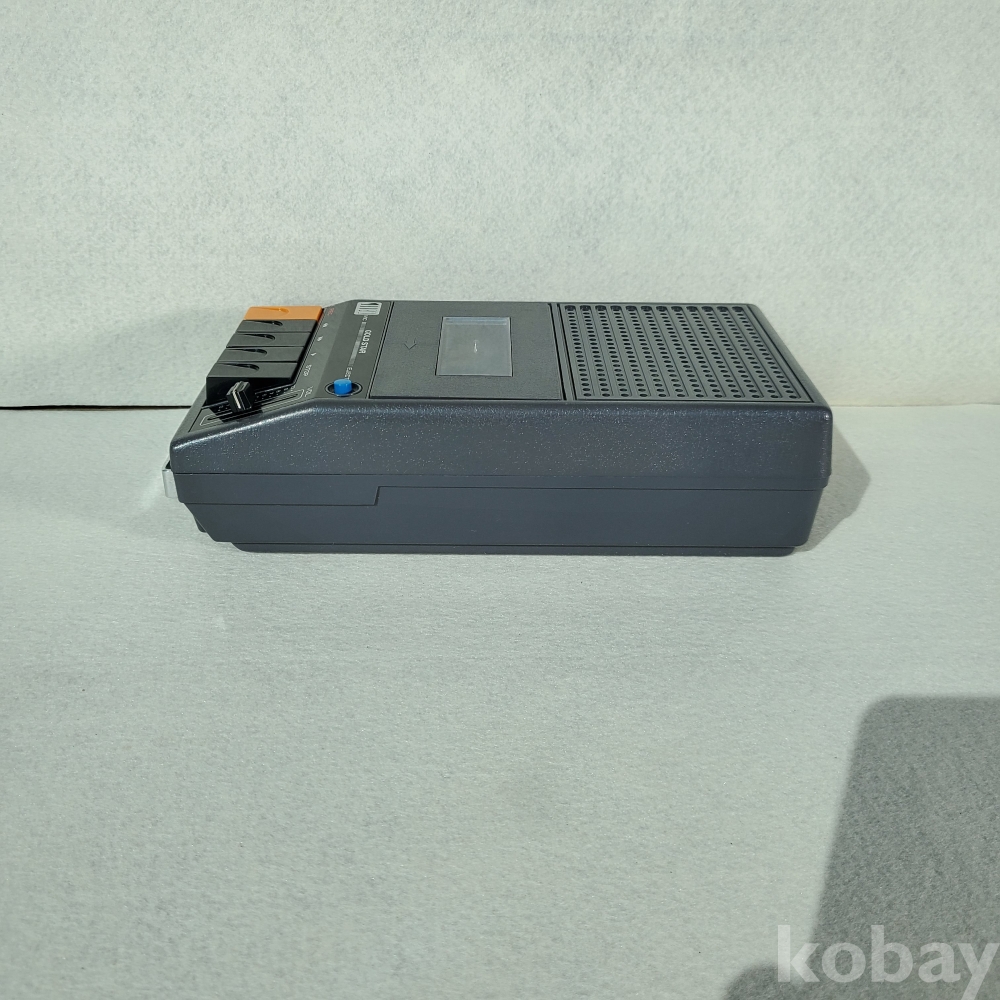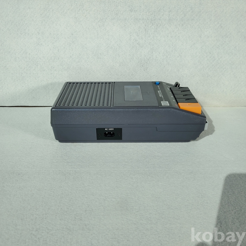 시선을 차분하게 잡아끄는 어두운 색상의 직사각형 본체와 전면을 채우고 있는 은빛 스피커 그릴, 그리고 하단에 나란히 배열된 직관적인 피아노 건반 방식의 조작 버튼(PLAY, REC, REW 등)은 당시 휴대용 녹음기가 추구했던 실용적이고 튼튼한 산업 디자인의 정수를 여과 없이 보여줍니다. 테이프가 돌아가는 양을 숫자로 보여주는 아날로그 테이프 카운터와 묵직한 조작 버튼을 '찰칵' 하고 누를 때 손끝에 전해지는 묵직한 기계적 감각은, 화면 터치에 익숙해진 현대인들에게는 결코 느낄 수 없는 귀중한 아날로그적 교감입니다.