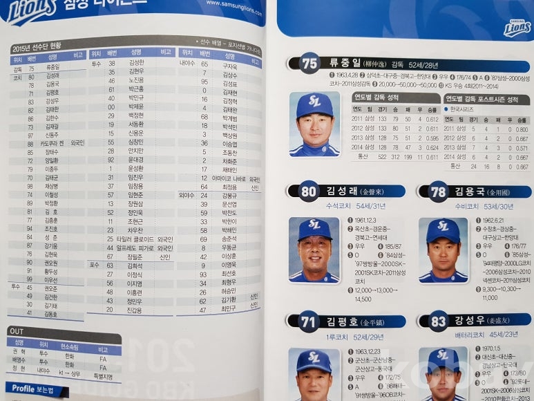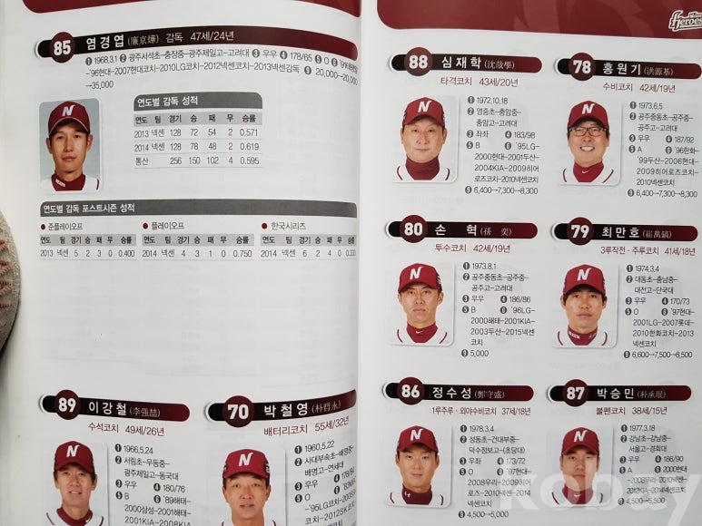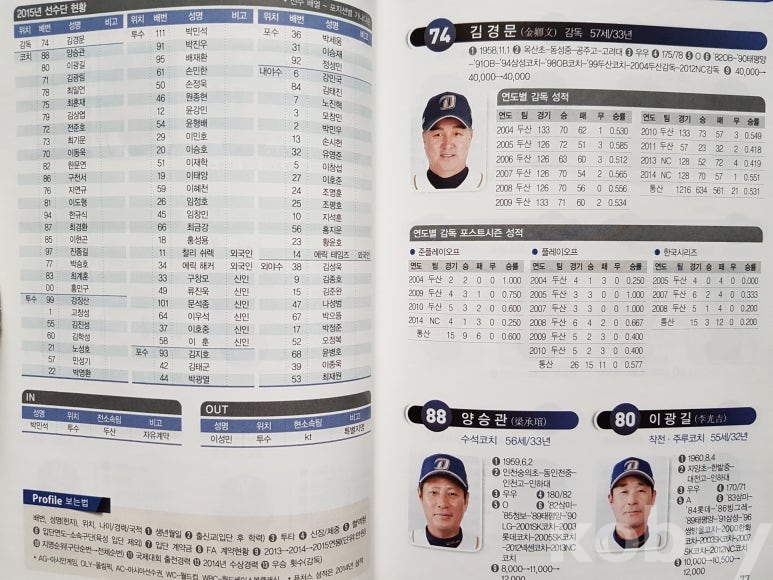 설명: 이 책의 오피셜 가이드북으로 속 내용에는 전 구단 선수 성명. 생년원일. 국적. 배번. 위치. 출신교. 투타. 신장/체중. 혈액형. 입단년도. 계약금. 년봉 등 등 기록 제공된 책입니다.