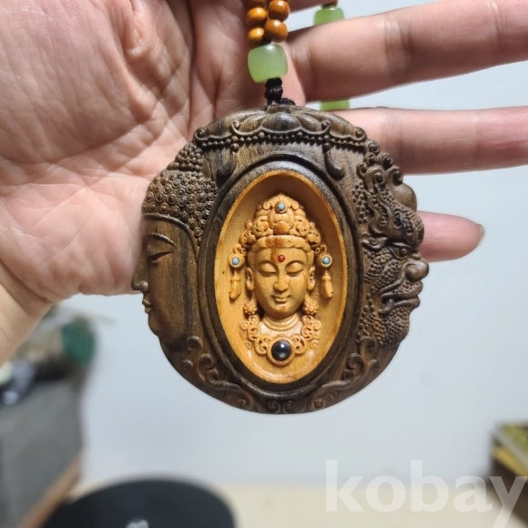 은은한 나무냄새가 나는 침향나무를 정교히게 조각한 불교 패입니다 미사용으로 상태 좋습니다