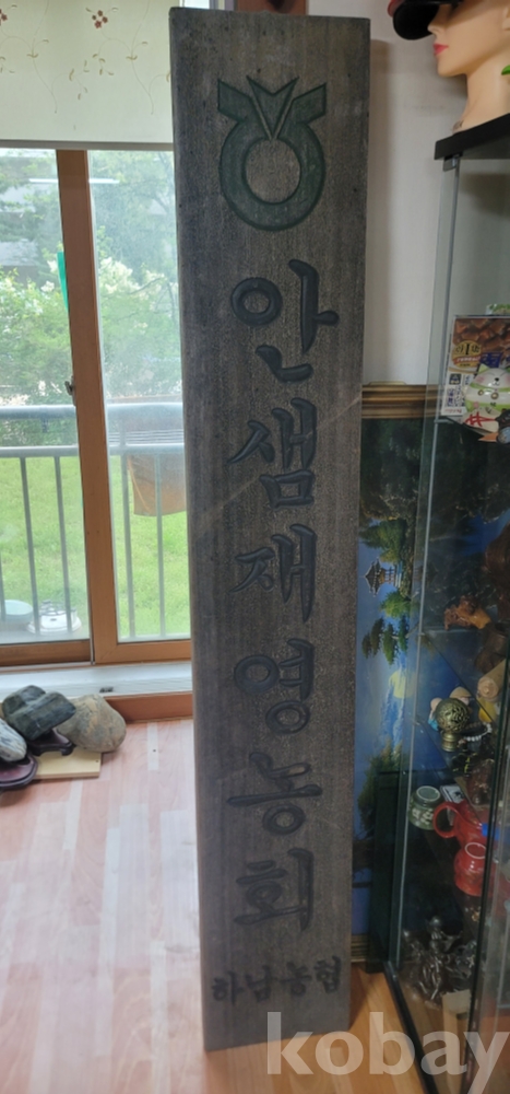하남농협 소속 **'안샘재영농회'**의 실제 대형 나무 현판입니다.
