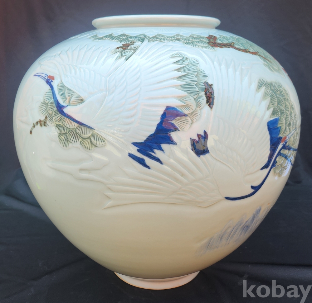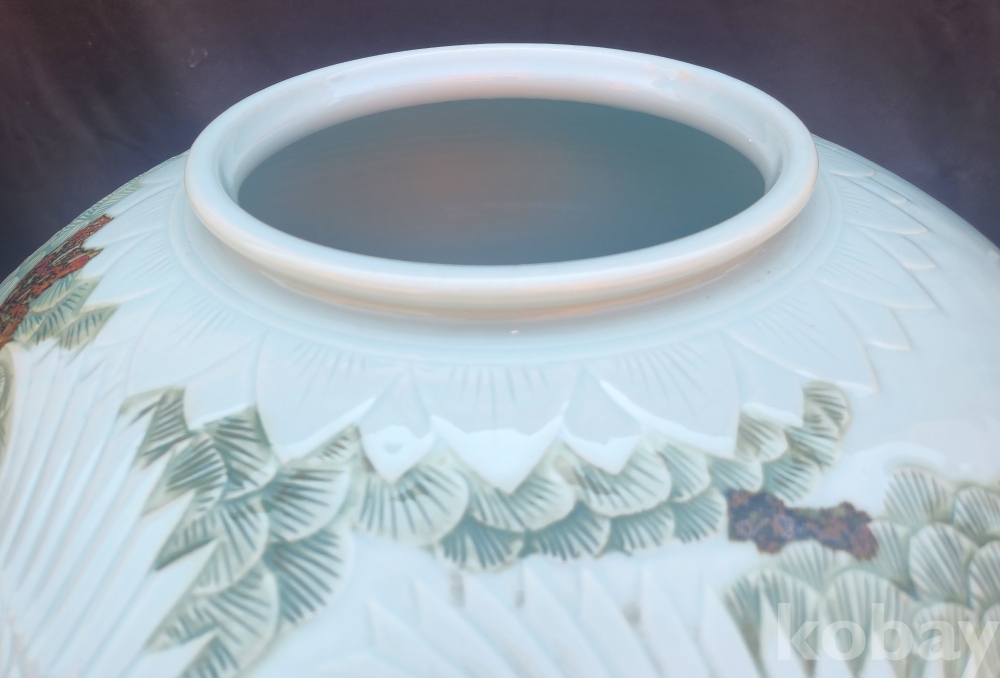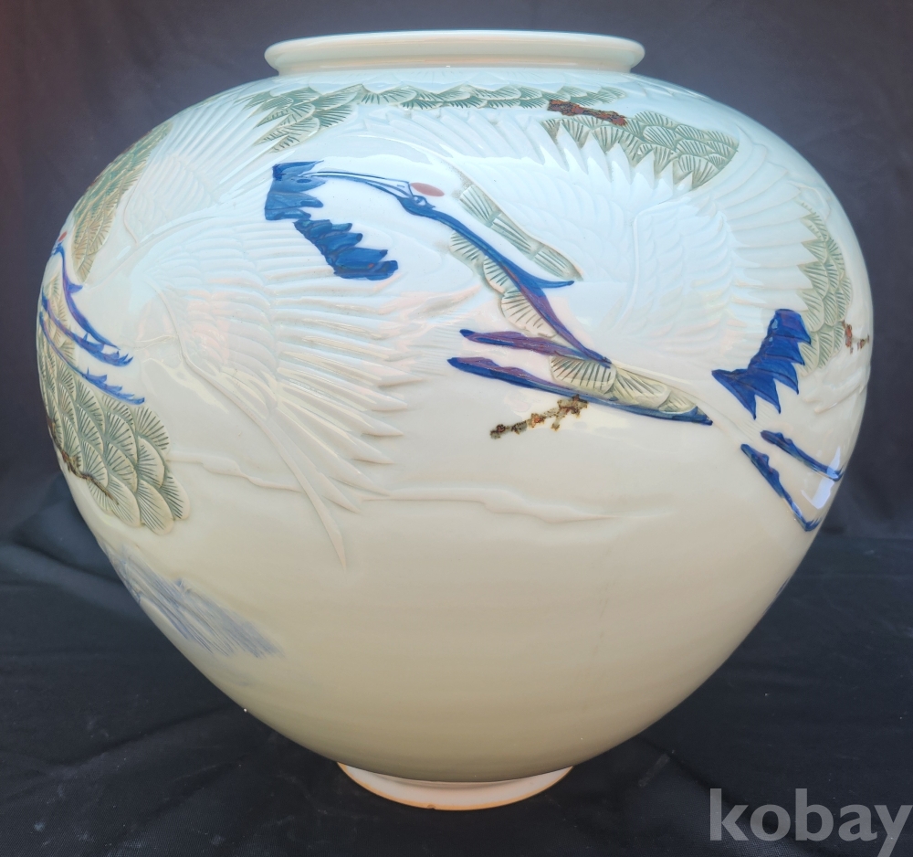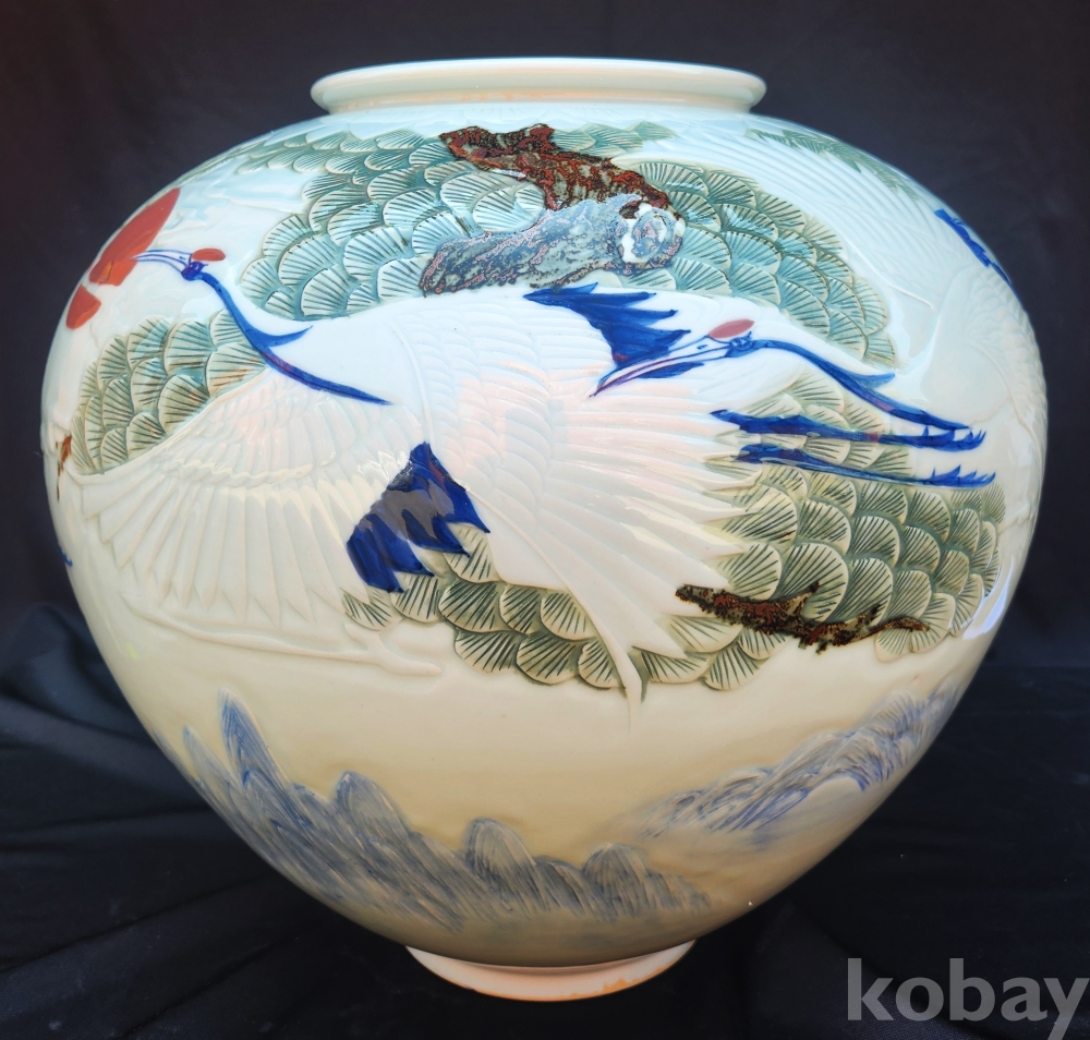 백자음각양각진사 일월운학문대호 白磁陰刻陽刻辰砂 日月雲鶴文大壺