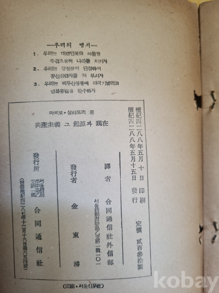 공산주의 그 기원과 현재, 4288년 183페이지 , 표지앞뒤면 떨어진 상태- 중고서적입니다