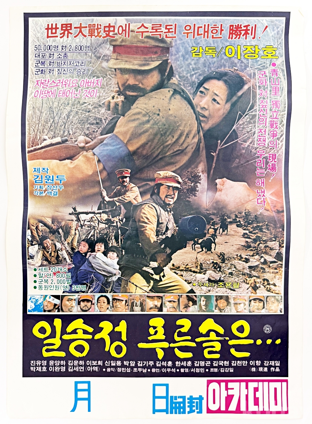 상품 설명 | 청산리 전투를 배경으로 한 영화 '일송정 푸른솔은'의 포스터이다. 제20회 백상예술대상에서 영화 부문 시나리오상을 수상하여 작품성을 높이 평가받았다. | ||