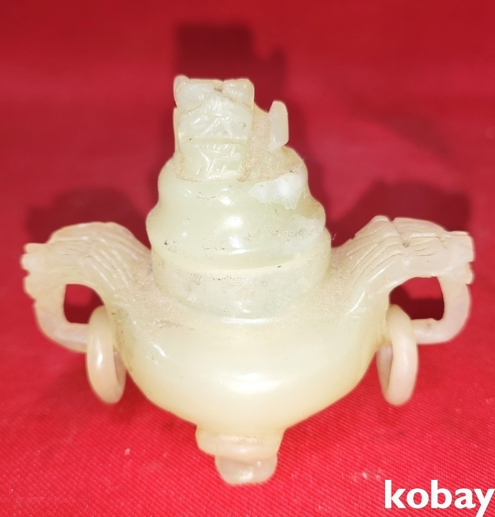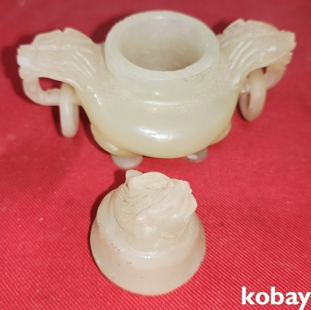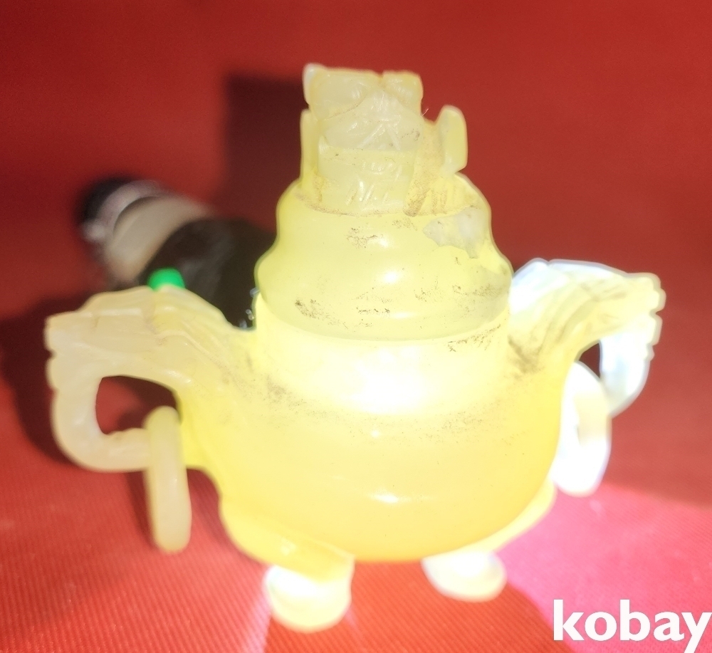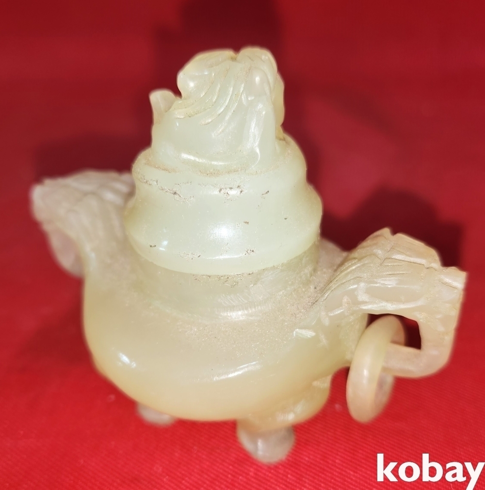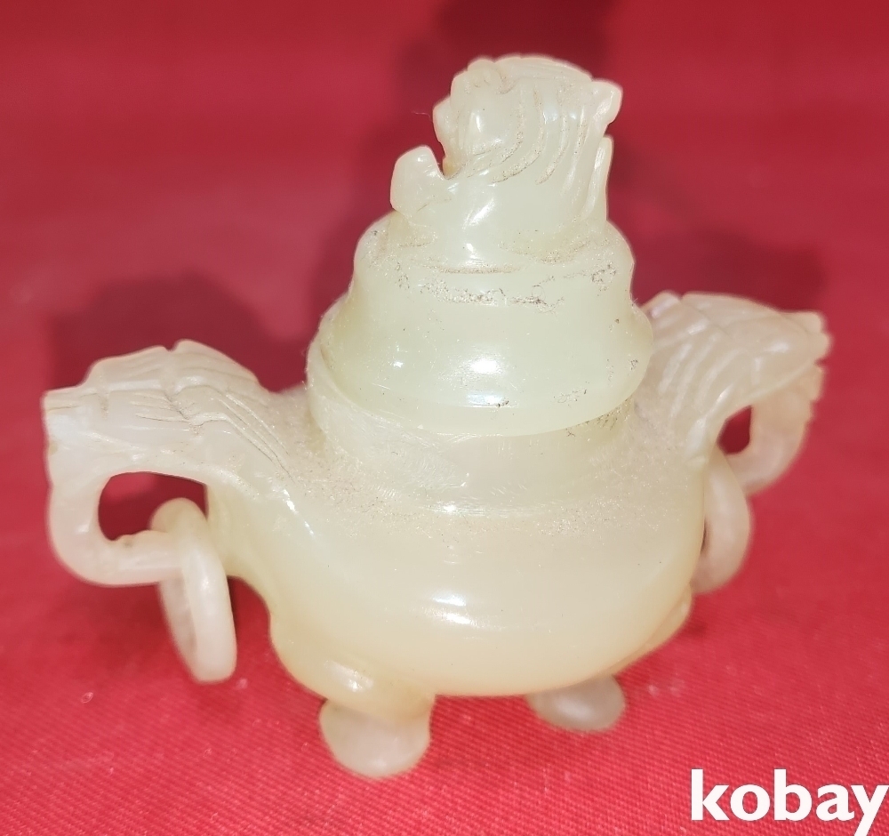 은은한 푸른 빛을 발산하는 옥(玉) 해태문양 삼족 향로입니다,