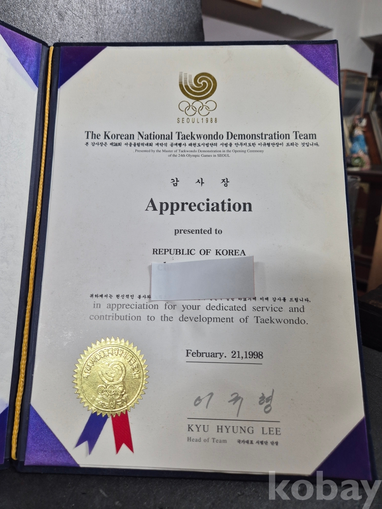 태권도 시범단에 수여한 감사장으로 1998년 2월 21일 관련자에게 수여한 것으로 보여집니다.