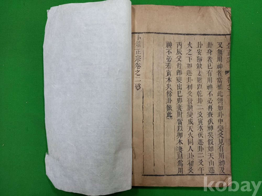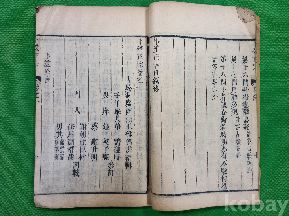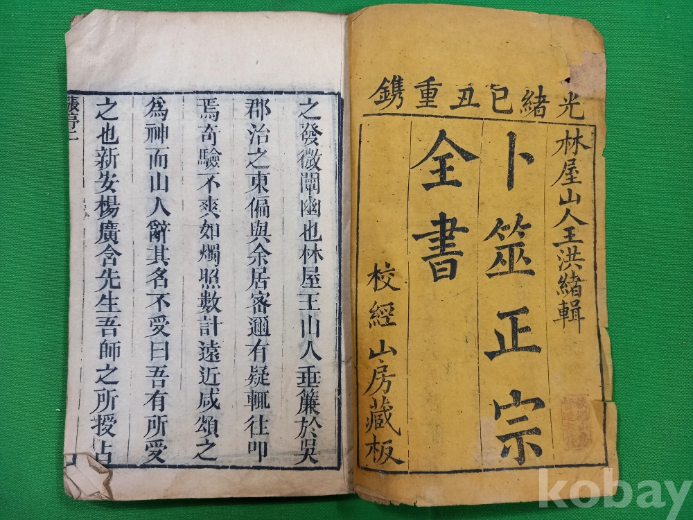 이 서적은 청나라 시대의 유명한 점술서인 [복서정종(卜筮正宗)] 전서 입니다. 청나라의 왕홍서(王洪緖)가 엮은 것으로, 주역의 64괘를 이용해 길흉을 판단하는 육효(六爻) 점술학의 집대성된 저작으로 평가받습니다