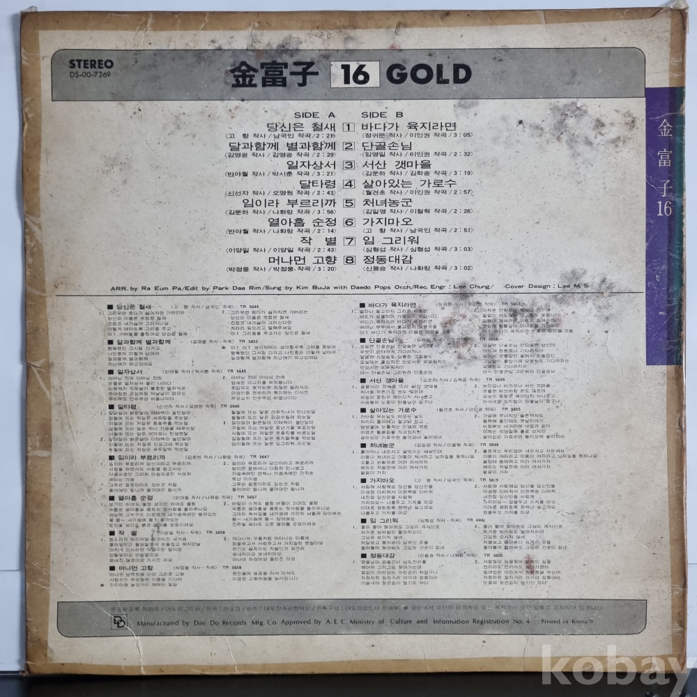 | 자켓상태 | VG : 주름, 접힘, 모서리 찢김 다수 | 음반상태 | VG : 생활 기스 다수, 가벼운 노이즈 존재 | 발매정보 | 알수없음 | 가사지여부 | 무 |