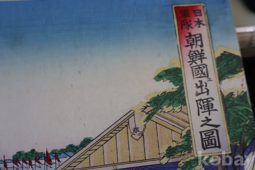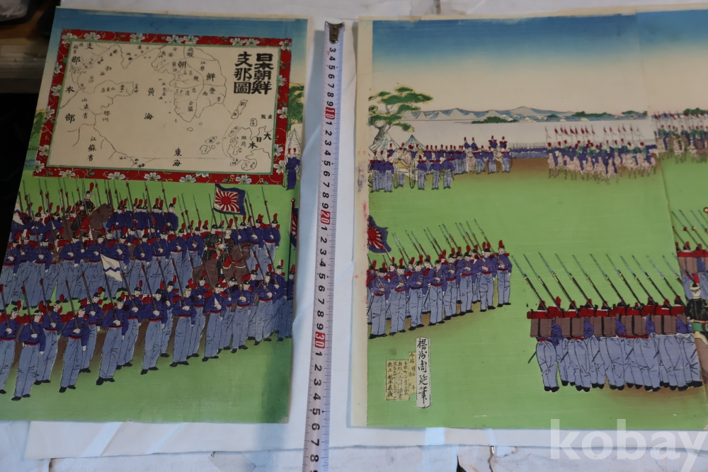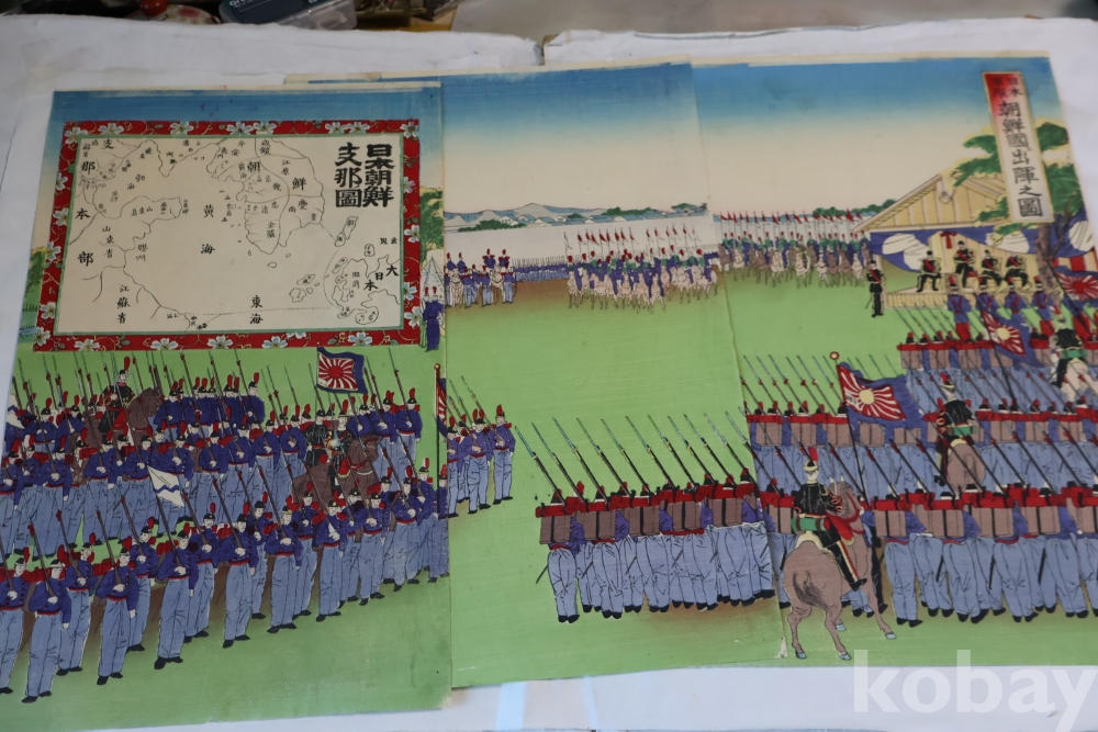 귀한 소제를 가진 19세기 목판화 3 세트 임니다 특히 3 나라의 지도가 보이는 유일무이한 명화 임니다 Artist: Chikanobu Yoshu (1838-1912)