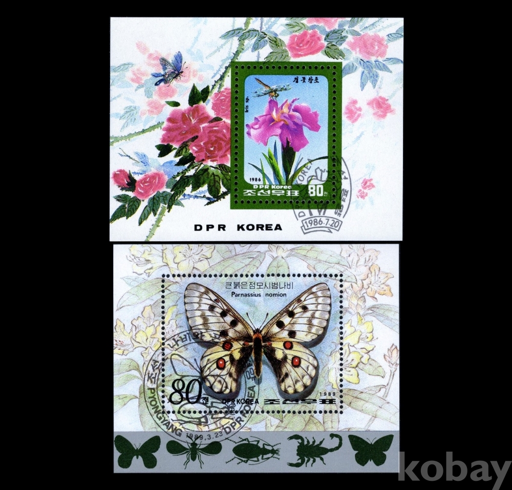 북한) 1986-89년 겹꽃창포, 큰붉은점 모시 범나비, 사용제