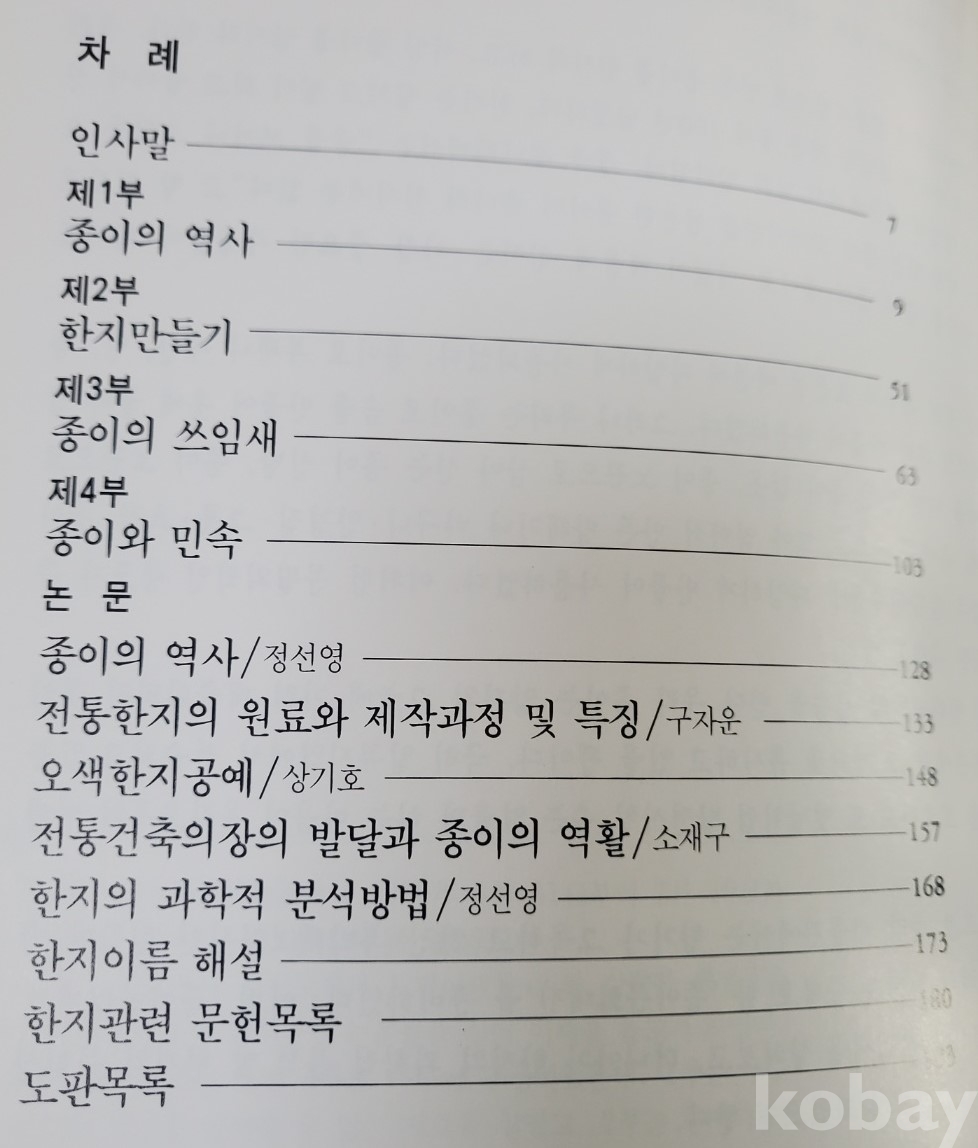 2. 목차 : 제1분 종이의 역사 / 제2부 한지만들기 / 제3부 종이의 쓰임새 / 제4부 종이와 민속 / 논문 4편 / 한지이름 해설 / 한지 관련 문헌 목록 / 도판 목록 /