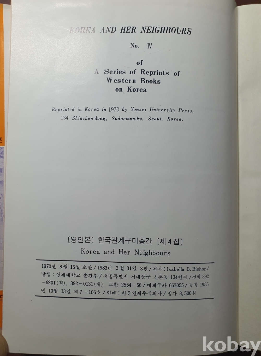 이사벨라 버드 비숍,연세대,1983년,상태는 양호 깨끗한 책,원서 영인본,하드커버
