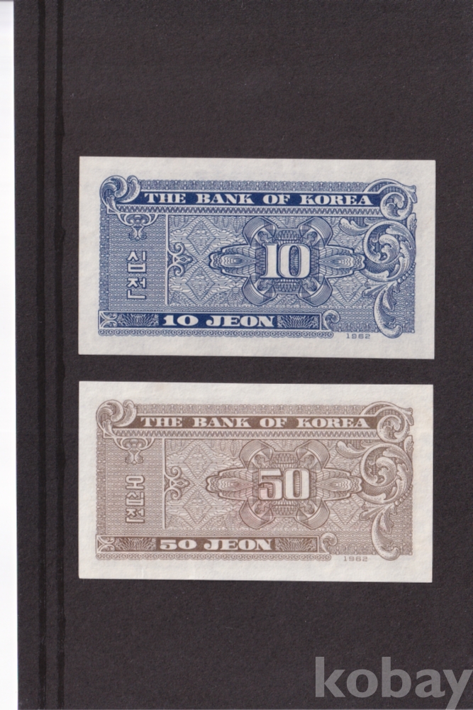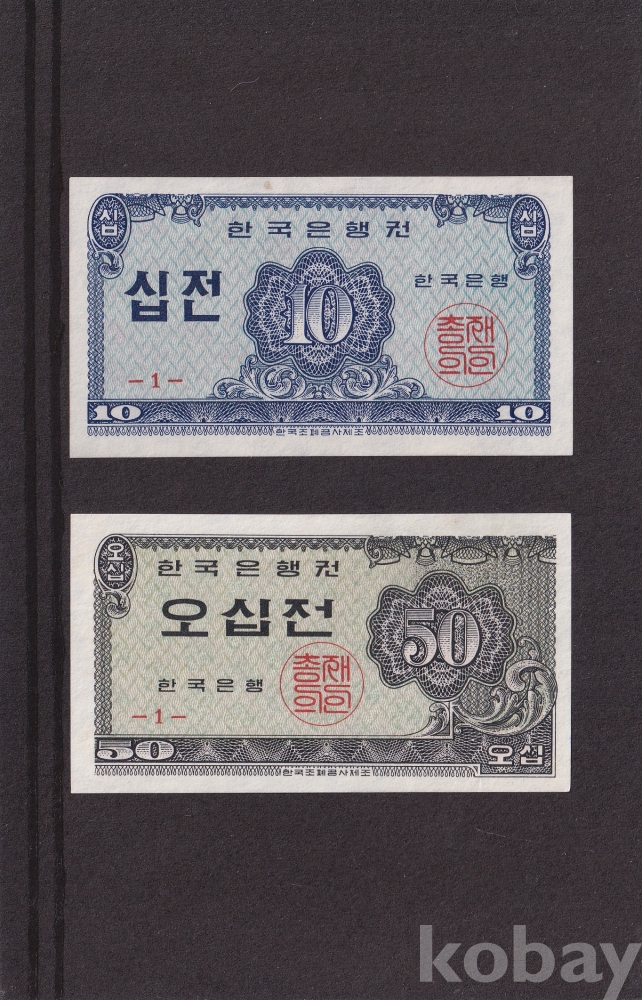 - 한국은행 1962년 소액 십전/오십전 판번호 1번 미사용 지폐 - 2장 일괄